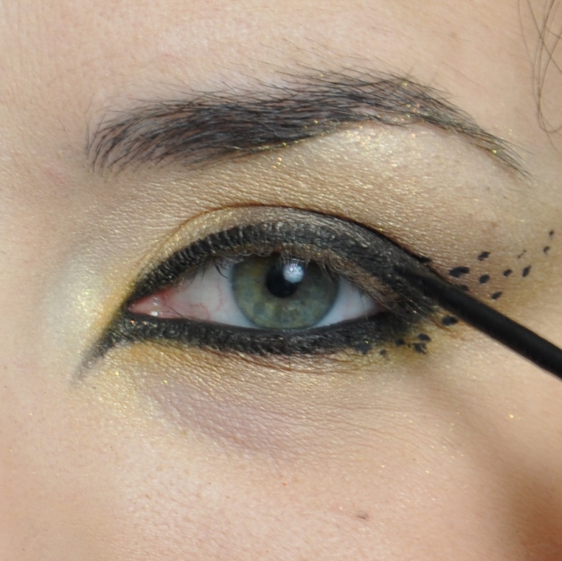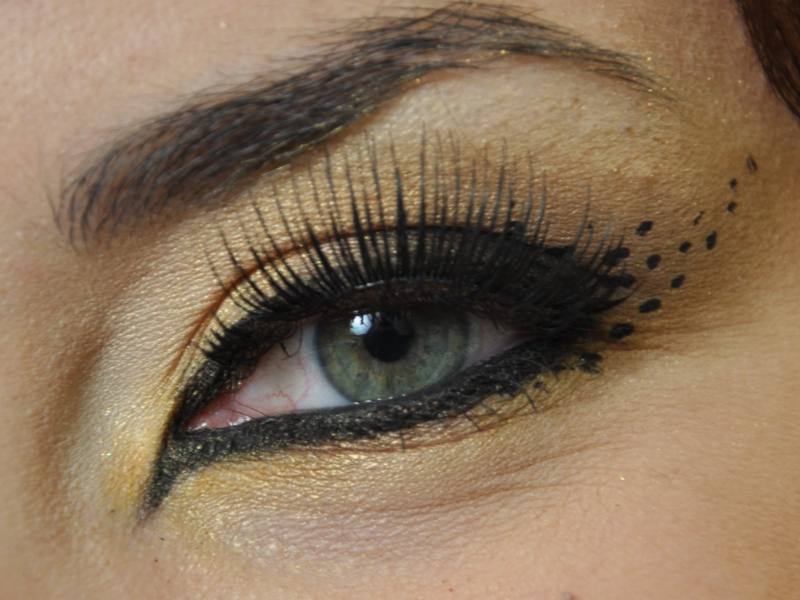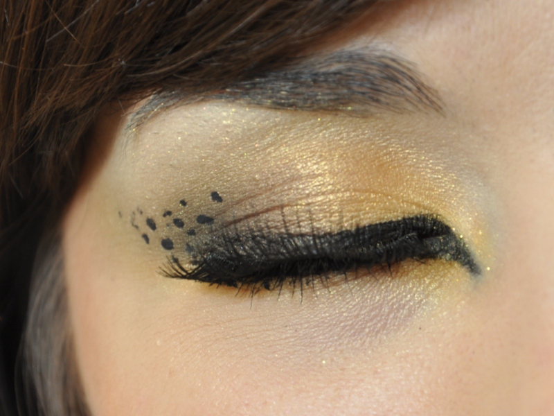 Kolory zastosowane w makijażu oka pochodzą z rodziny ciepłej gamy żółci, złota i brązu - czyli wszystkie te barwy, które mi osobiście najbardziej przywodzą na myśl gorące futerko dzikich kotów. Dla uzyskania efektu, jak najbardziej sugerującego drapieżne skojarzenia i inspiracje, makijaż oka wyciągnęłam intensywnie w kierunku do skroni . O efekcie końcowym niekwestionowanie zadecydowały jednak nie kolory, a różnorodne kropeczki wykonane czarnym linerem, które przy pomocy naszej wyobraźni mają najlepiej sugerować charakter makijażu.