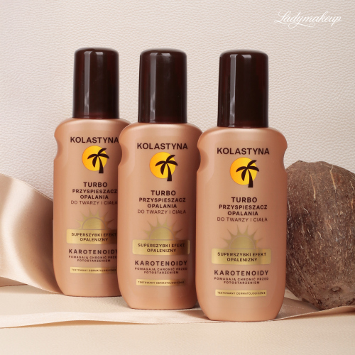 Chcesz szybko uzyskać opaleniznę? Pomoże Ci w tym turbo przyspieszacz opalania do twarzy i ciała Kolastyna. Możesz go z powodzeniem stosować zarówno na całe ciało, jak i na samą twarz. Jego szybkoschnąca formuła została wzbogacona o karotenoidy, czyli naturalny antyoksydant, który dobrze przeciwdziała fotostarzeniu się skóry. Kolastyna skutecznie stymuluje wytwarzanie melaniny i pomaga utrzymać odpowiedni poziom nawilżenia naskórka.