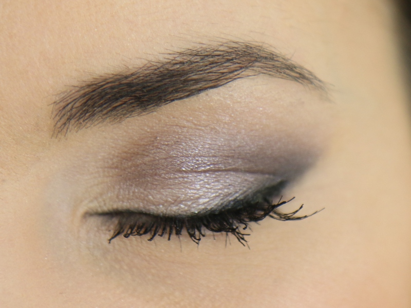 - Jasnym, metalicznym cieniem, lekko różowym, pokryj całą powiekę ruchomą.
