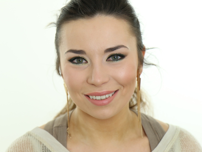 - Dolną powiekę pokryj kolejno - zaczynając od zewnętrznej strony - kolorem brązowym - przy samych rzęsach, następnie pod brązem umieść kolor ciemny zielony, a za nimi: metaliczny zielony i seledyn.