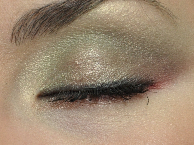 - Sięgamy po ciemny zielony cień, lekko w padający w kolor khaki/zgniłej zieleni. Rozcieram ten cień przy pomocy pędzelka puchacza wzdłuż całej powieki górnej, na jej nieruchomej części.