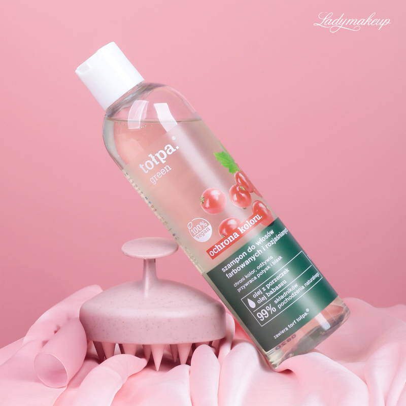 Innym, ale wciąż świetnym kosmetykiem jest szampon do włosów farbowanych Tołpa Green, który sprawdzi się świetnie także na rozjaśnianych kosmykach. Polubisz jego 100% wegańską formułę, w której znajdziesz aż 99% składników pochodzenia naturalnego, w tym: torf tołpa, oleje z porzeczek i babassu, a także betainę, kwas mlekowy, czy roślinną glicerynę. Ten szampon zapewni Ci delikatne, a zarazem skuteczne mycie, a przy okazji ochroni pasma, odświeży i je i przedłuży trwałość koloru.