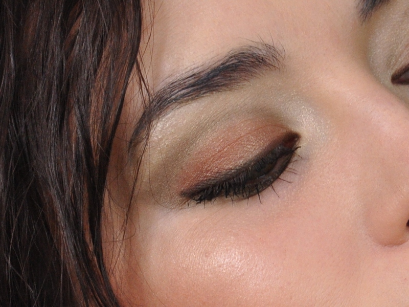 - Oliwkowym cieniem podkreślam dolną powiekę. Pędzelek z tym samym cieniem prowadzę od zewnętrznej strony ku górze, tak aby płynnym ruchem zaznaczyć kształt listka na górnej powiece. Kontury kreślimy aż do wewnętrznego kącika oka.