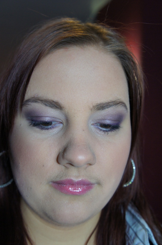 3. Makijaż fioletowy - zestawienie różnych cieni w kolorach fiolet, bakłażanu. Makijaż intensywny jak na dzień - najważniejsze jednak są upodobania modelki :) (niestety nie było czasu na pozbycie się niepożądanych włosków...)