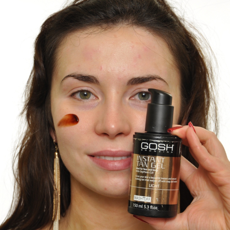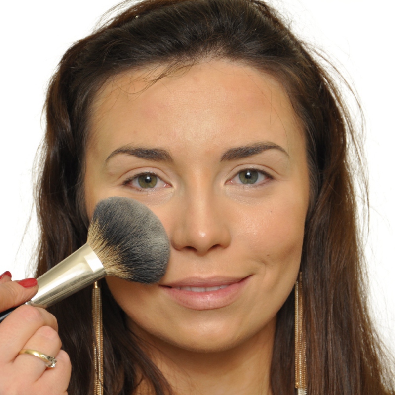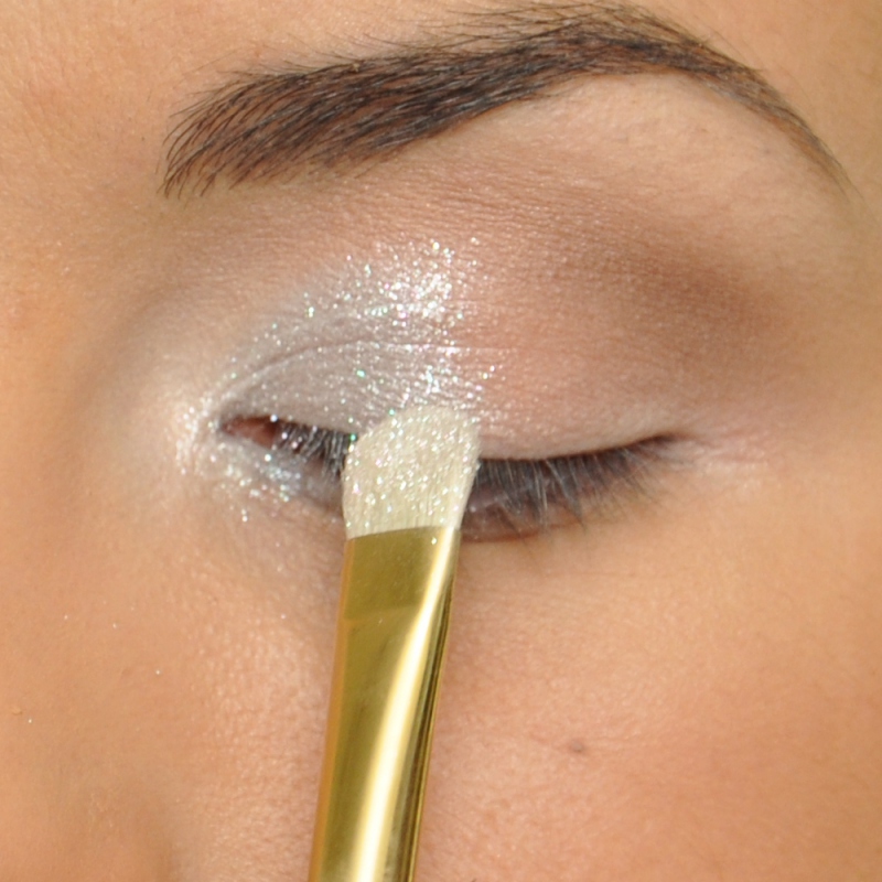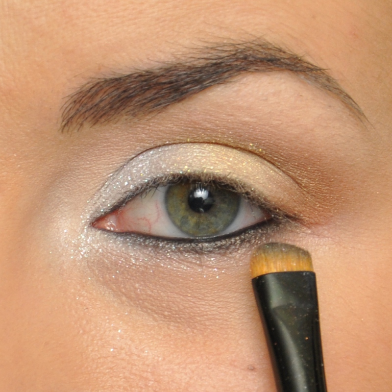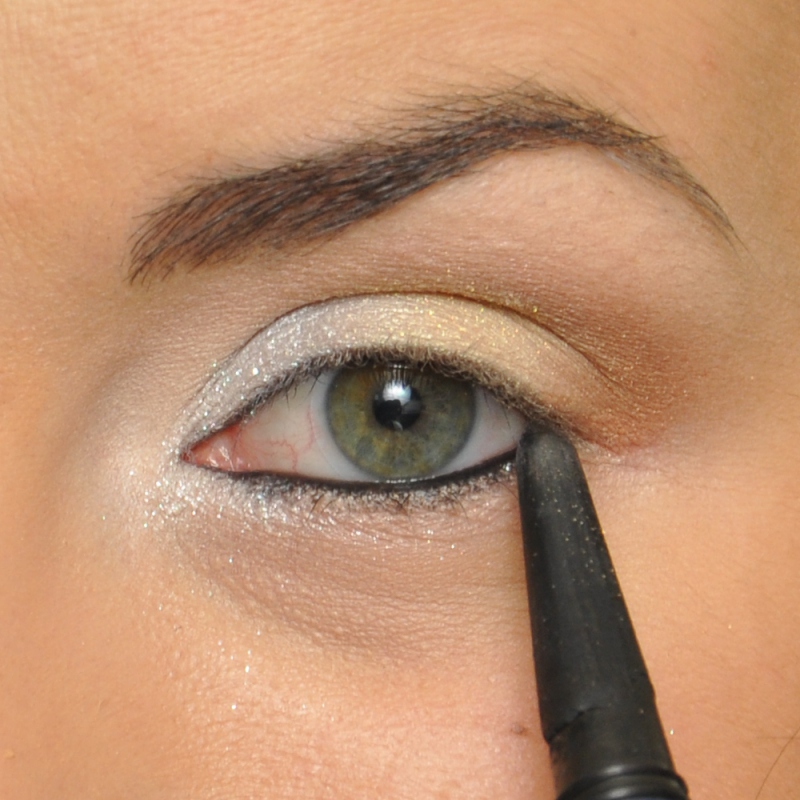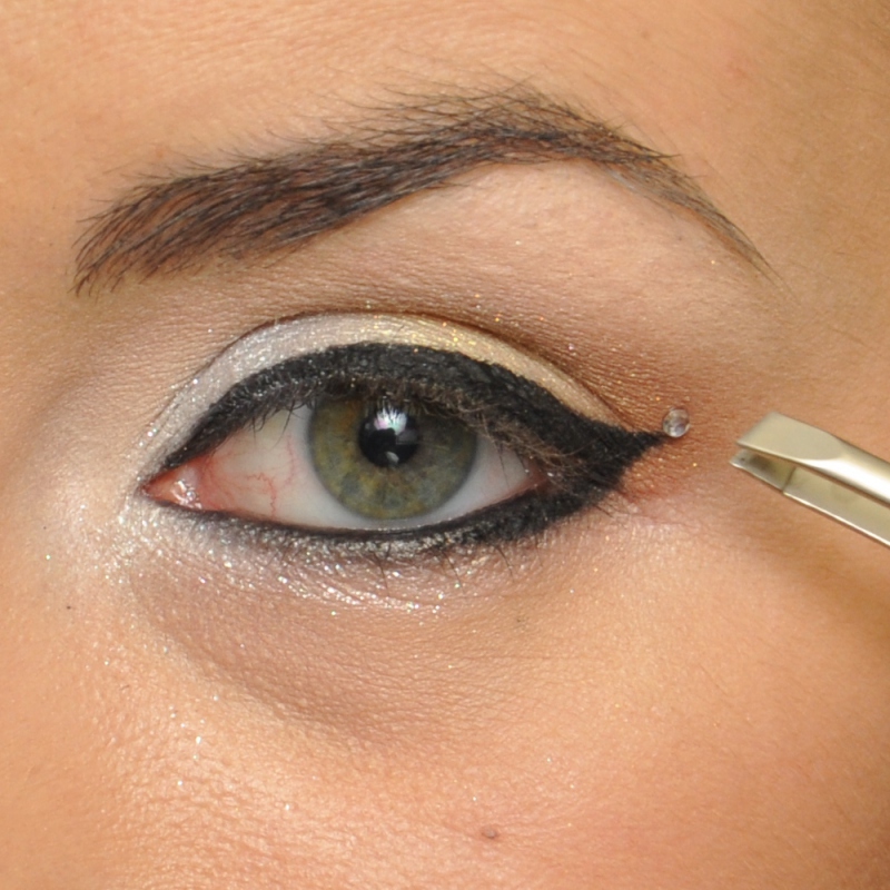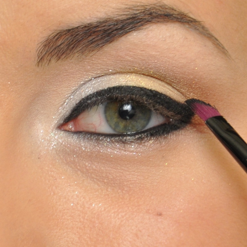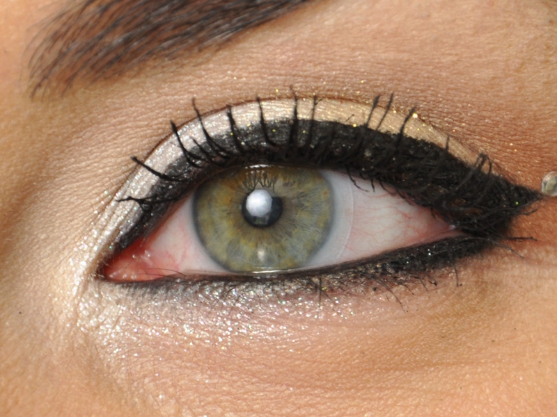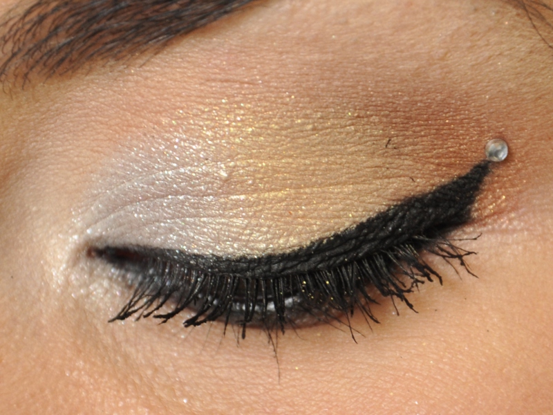 Ostatni makijaż, który chciałabym zaproponować Wam na zakończenie minionego roku, to bardzo rozświetlająca twarz wersja makijażu wieczorowego. Do jego wykonania wykorzystałam kolory, które kojarzą mi się stricte z makijażem na wieczór - złoto oraz srebro . Całość przyciemniona została bardzo grubą kreską narysowaną eyelinerem w żelu, na zakończeniu której dodałam małą cyrkonię. Wewnętrzna linia wodna, zarówno ta dolna, jak i górna, pokryta została arabskim \" kholem\" - ziołowym specyfikiem w formie sztyftu, który niebywale przyczernia te miejsca jednocześnie podkreślając biel oka. Dla uzyskania jak najlepszego kontrastu powiek z pozostałymi partiami twarzy oraz lepszego efektu rozświetlenia, przed przystąpieniem do malowania, przyciemniłam cerę żelem natychmiastowo brązującym.