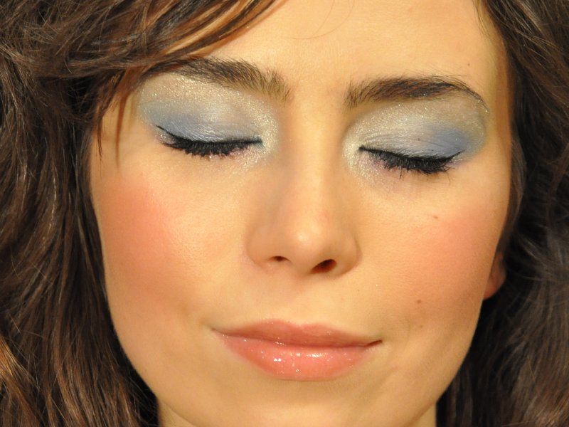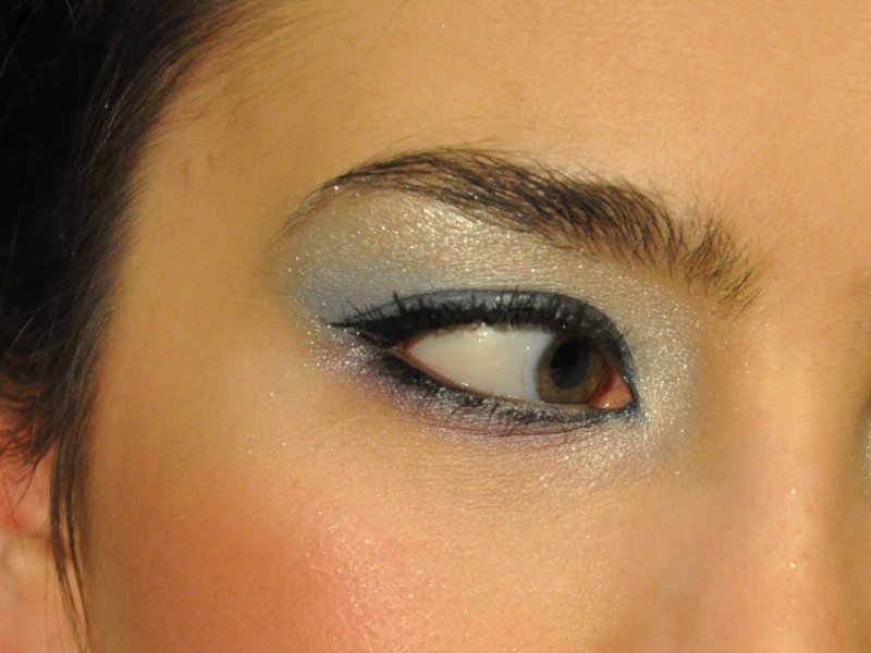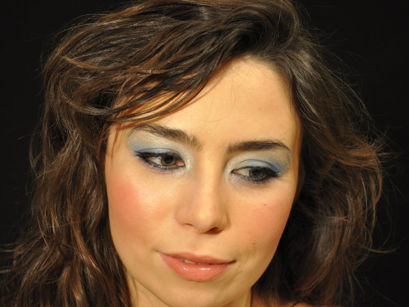 - Błękitny cień umieszczamy na ruchomej powiece, jaśniejszy kolor od wewnątrz, ciemniejszy kolor od zewnątrz. Rozcieramy kolorki.