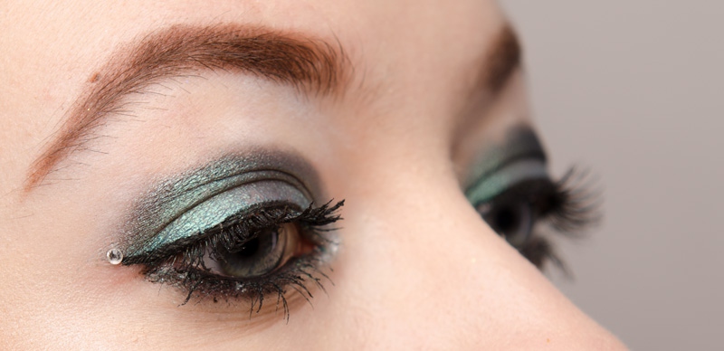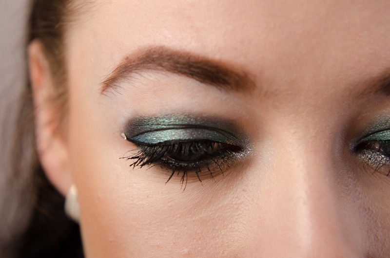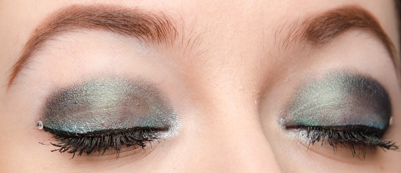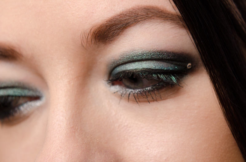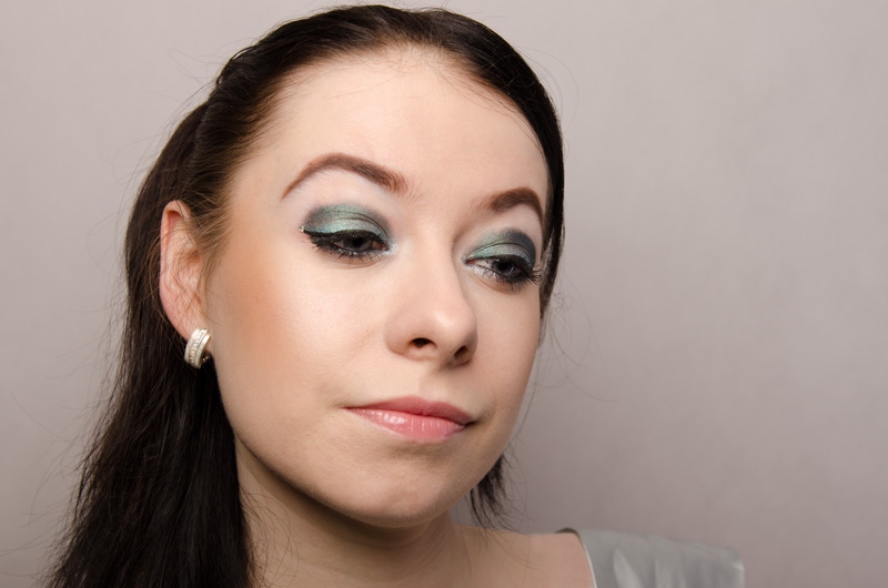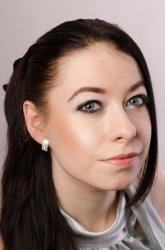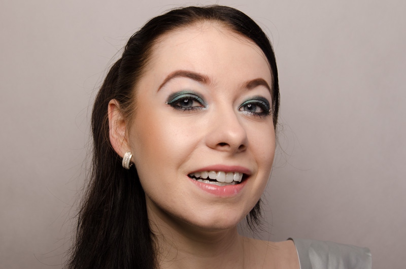 Skupiłam się na oczach: wybrałam kolory turkusowo -zielone , z lekką domieszką szarości , czerni i odrobiną srebra , wszystkie odcienie są połyskujące.Zdecydowałam się też na delikatną czarną kreską , a na jej końcu umieściłam malutką cyrkonię:)