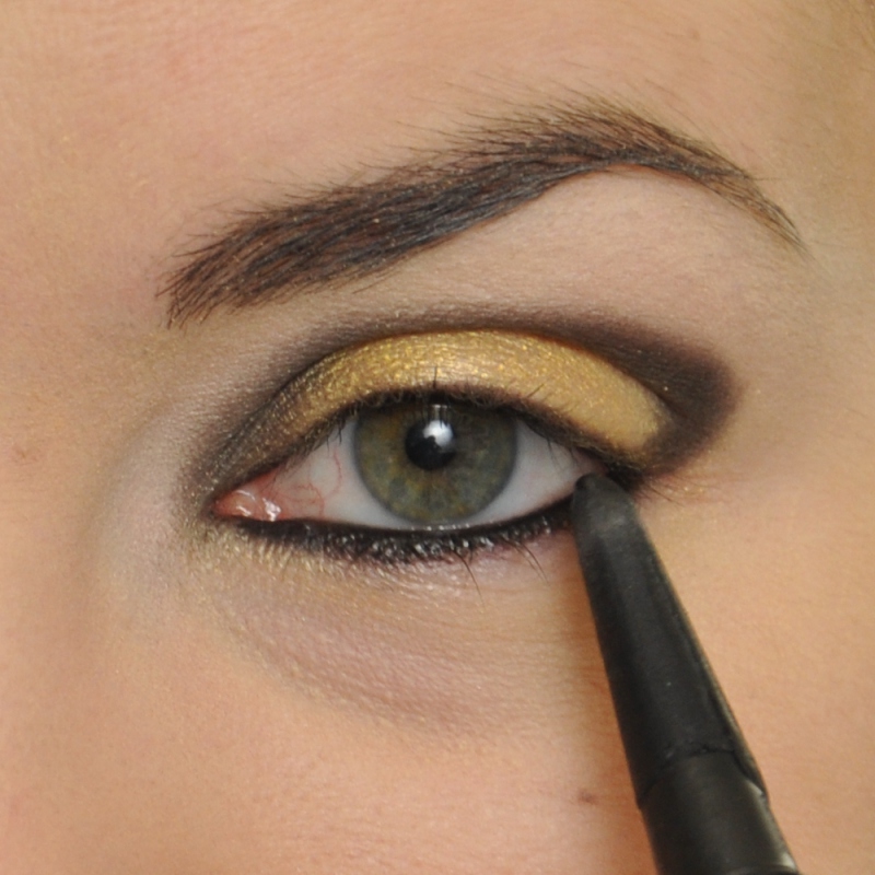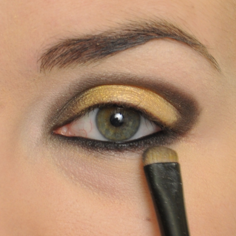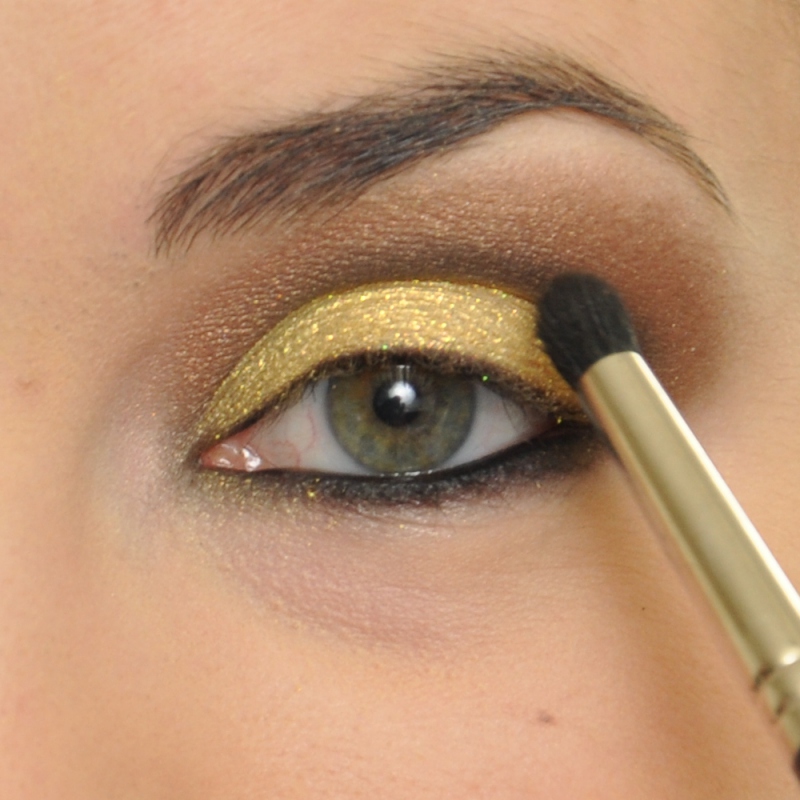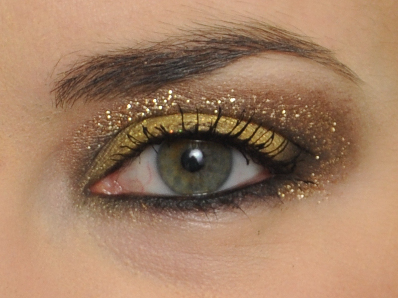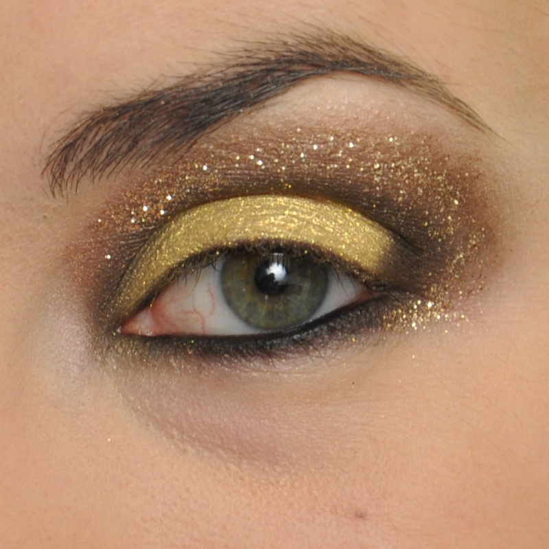 Pomysł zdecydowanie dla osób przebojowych i odważnych, które lubią zwracać na siebie spojrzenia innych. Kolorystyka złota, czerni i brązów pasować będzie przede wszystkim do kreacji czarnych, złoty, brązowych i czerwonych. Jeśli jednak zastosuje się cień złoty w chłodniejszej tonacji, czerwony ubiór również będzie do niego idealny. Makijaż jest jednak na tyle uniwersalny, że w zasadzie powinien współgrać ze wszystkimi kolorami tęczówek - począwszy na zielonych (jak moje), skończywszy na niebieskich. W przypadku, gdyby okazało się, że makijaż jest dla Was zbyt intensywny, proponuję ozdobić powiekę mniejszą ilością brokatu - wówczas będzie on bardziej stonowany, a w dalszym ciągu wieczorowy i pasujący na tą okazję. Myślę, że oprócz złota ciekawie przedstawiałby się w kolorach różwo-fioletowych oraz w zieleni.