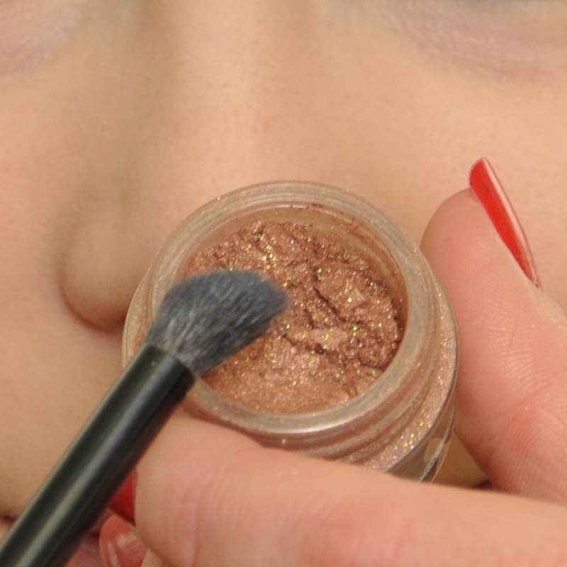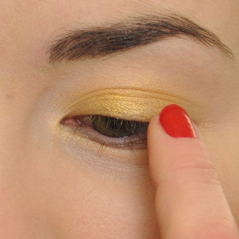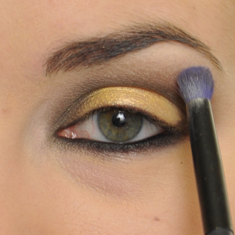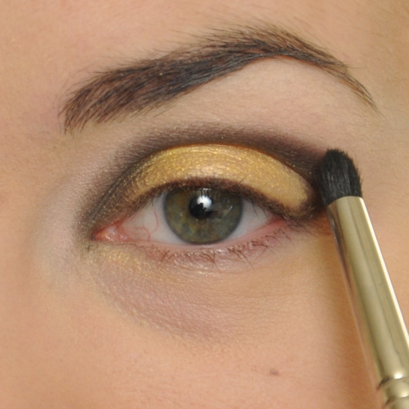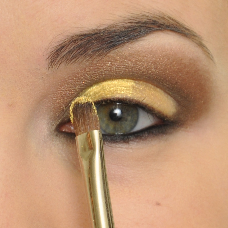 Pomysł zdecydowanie dla osób przebojowych i odważnych, które lubią zwracać na siebie spojrzenia innych. Kolorystyka złota, czerni i brązów pasować będzie przede wszystkim do kreacji czarnych, złoty, brązowych i czerwonych. Jeśli jednak zastosuje się cień złoty w chłodniejszej tonacji, czerwony ubiór również będzie do niego idealny. Makijaż jest jednak na tyle uniwersalny, że w zasadzie powinien współgrać ze wszystkimi kolorami tęczówek - począwszy na zielonych (jak moje), skończywszy na niebieskich. W przypadku, gdyby okazało się, że makijaż jest dla Was zbyt intensywny, proponuję ozdobić powiekę mniejszą ilością brokatu - wówczas będzie on bardziej stonowany, a w dalszym ciągu wieczorowy i pasujący na tą okazję. Myślę, że oprócz złota ciekawie przedstawiałby się w kolorach różwo-fioletowych oraz w zieleni.