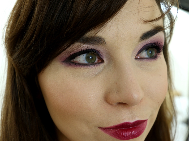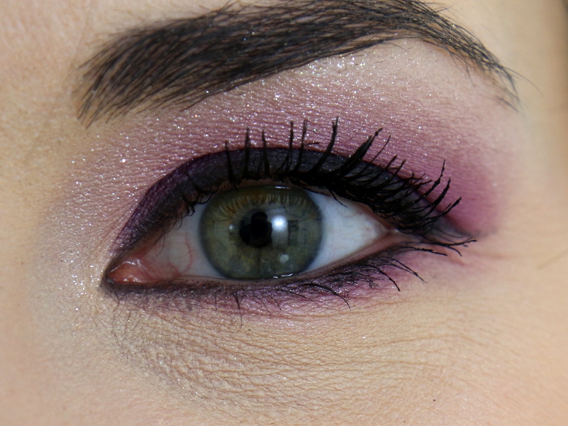 - Innym cieniem w kolorze fuksji/wrzosu przyciemnij linię załamania powieki.
