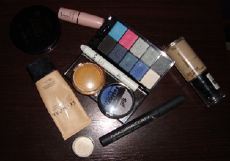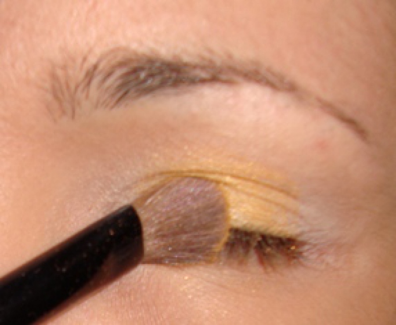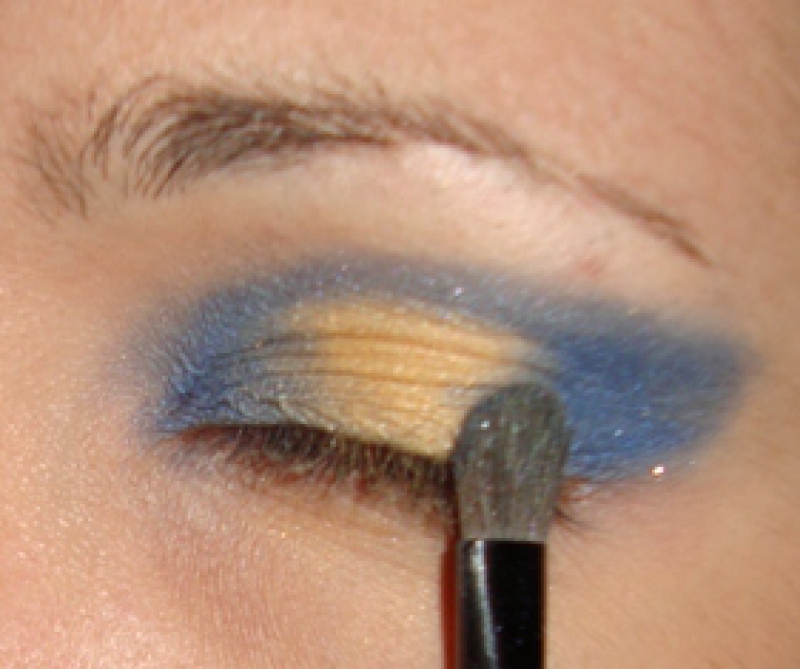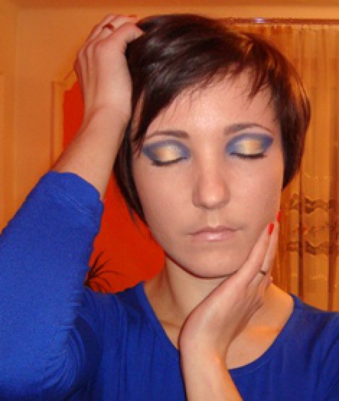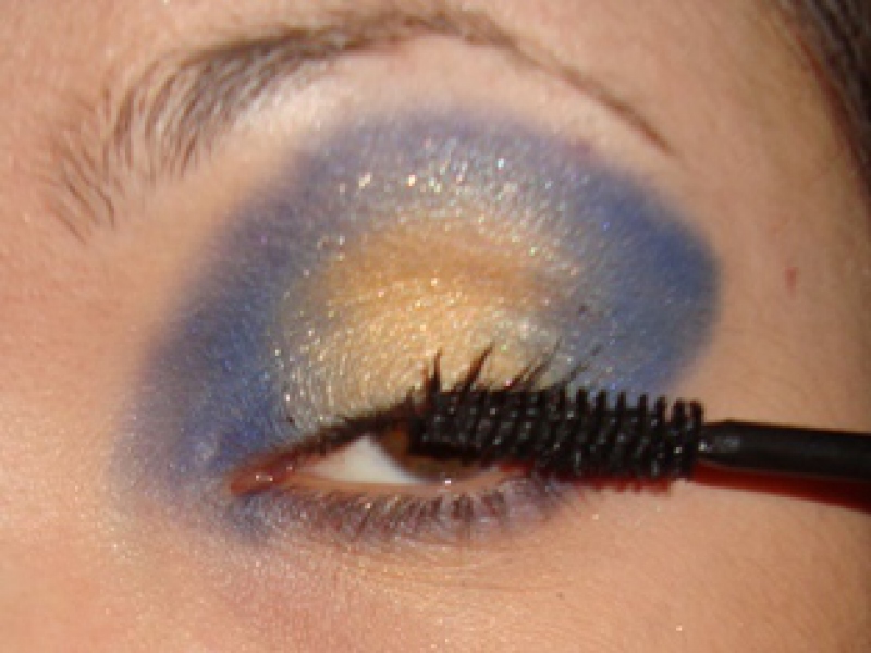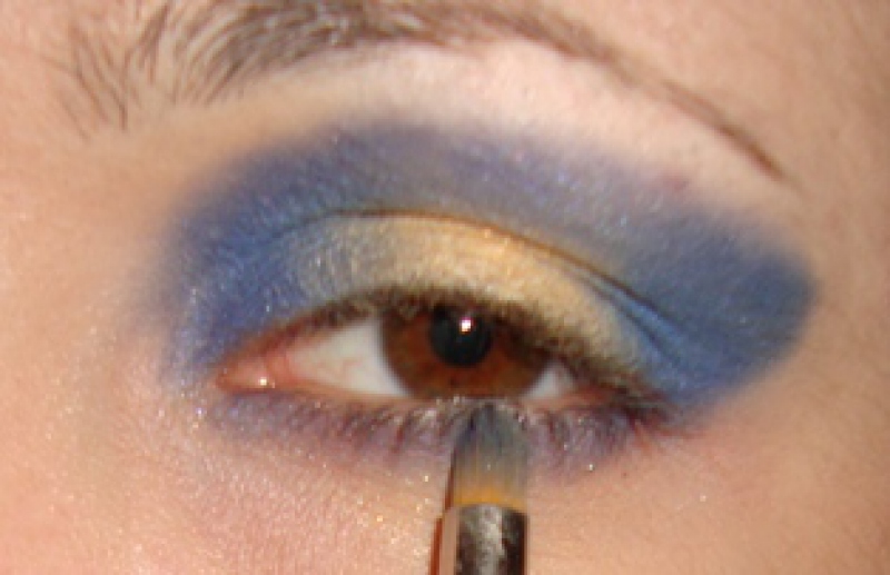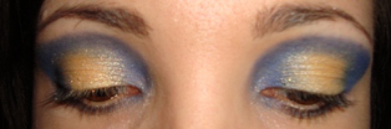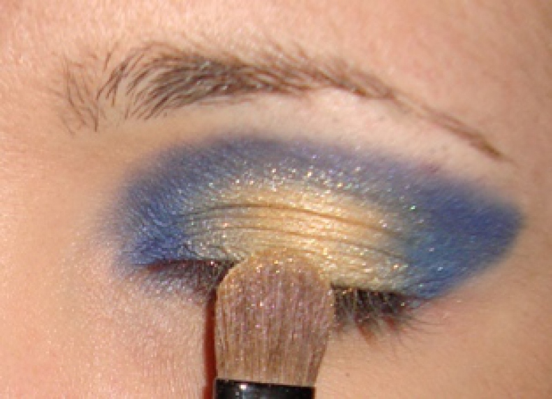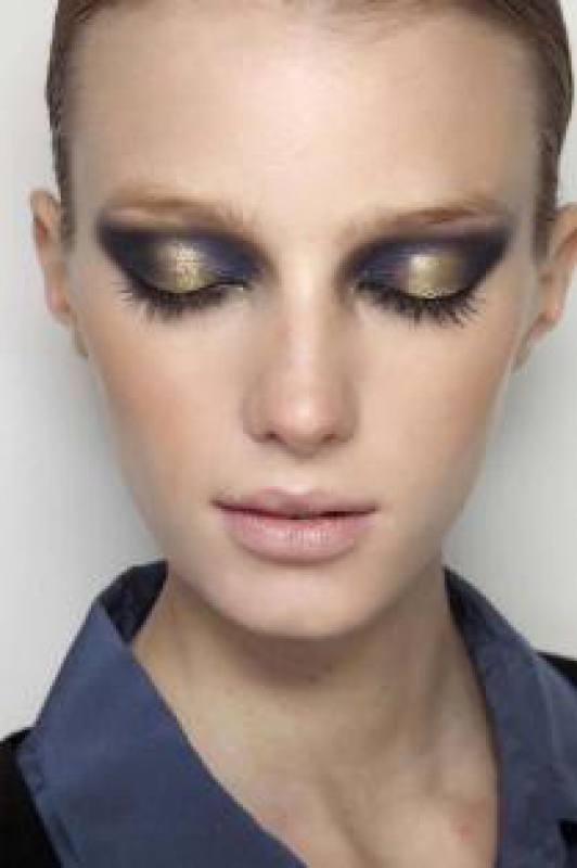 Podczas pokazu używano kosmetyków marki MAC (ja używam tańszych, tak aby każdy mógł go wykonać). Głównymi i jedynymi kolorami są złoto i granat . Złoty odcień akcentuje środek powieki oraz wewnętrzny kącik oka. Pozostała część makijażu jest bardzo naturalna, stanowiąca jedynie tło dla bardzo wyrazistego makijażu. Z tego właśnie powodu użyłam ciemniejszego o kilka tonów podkładu , zamiast bronzera.