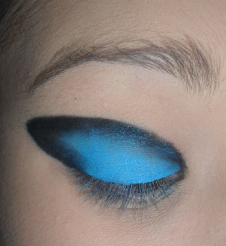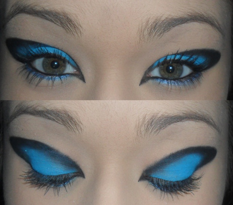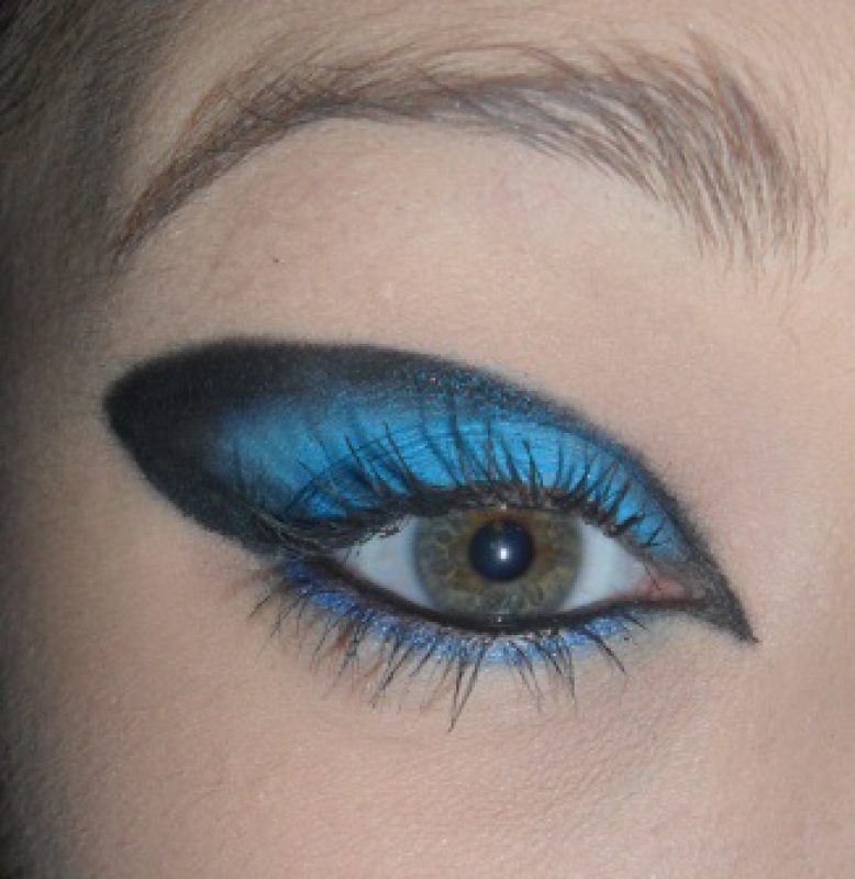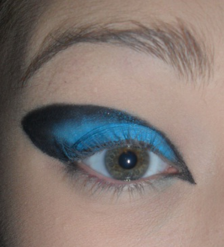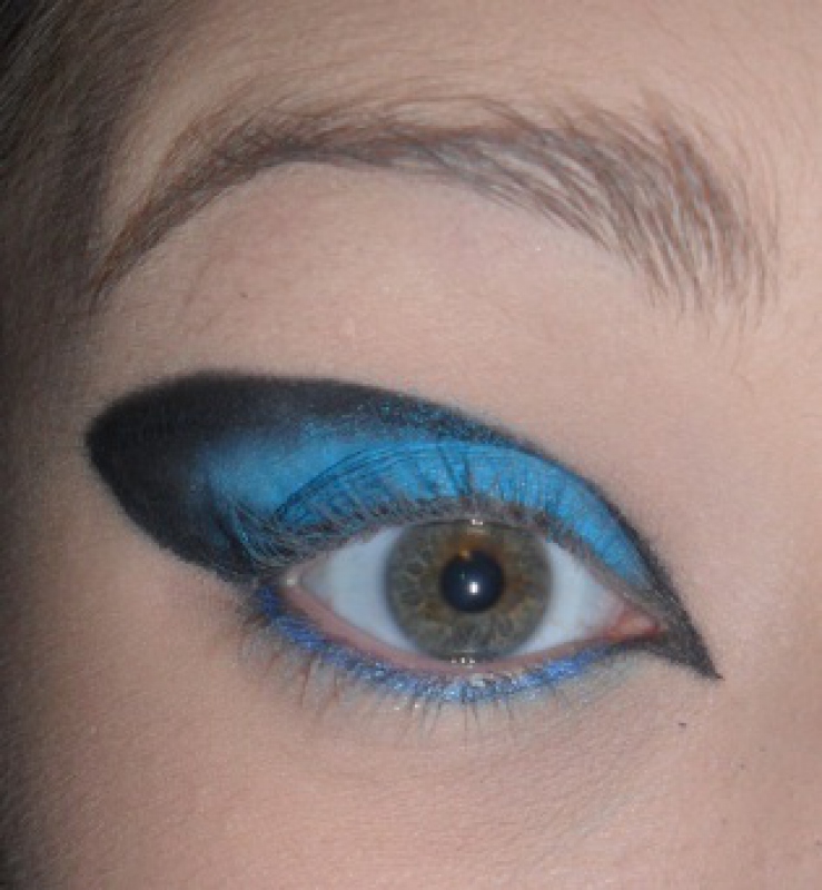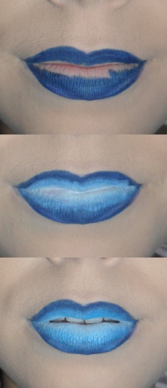 Najpierw granatową kredką rysujemy zarys ust oraz wypełniamy je do połowy tym samym kolorem. Następnie resztą uzupełniamy białą kredką, aby powstało wrażenie zlewania się kolorów. Można sobie pomóc cieniami do powiek (tymi, których użyliśmy do pomalowania oczu). Oczywiście od siebie pododawałam trochę akcentów: naniosłam brokat kosmetyczny na policzki i czarną kredką namalowałam łuski (wypełniłam je niebieskim cieniem).