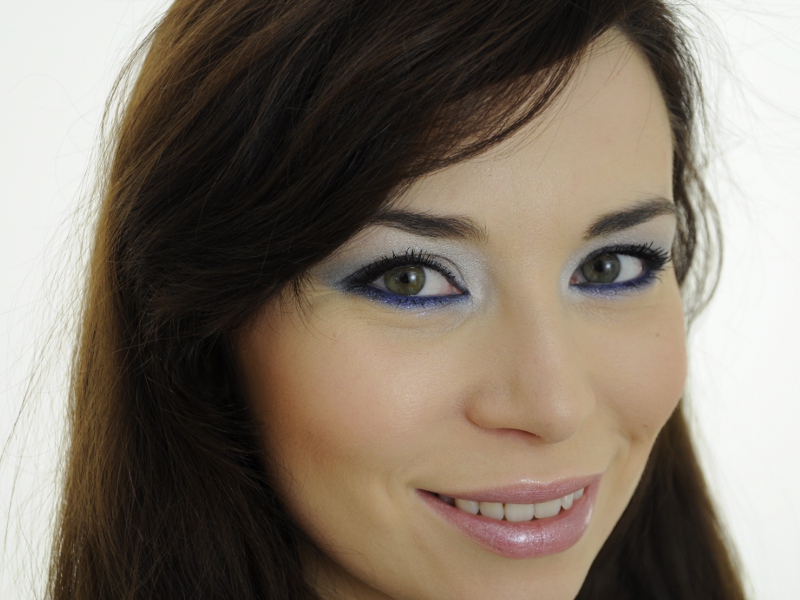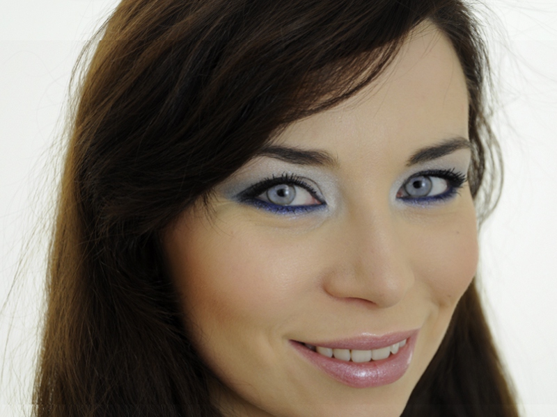 - Całą powiekę pokryj błyszczącymi, drobno zmielonymi drobinkami odbijającymi na niebiesko.