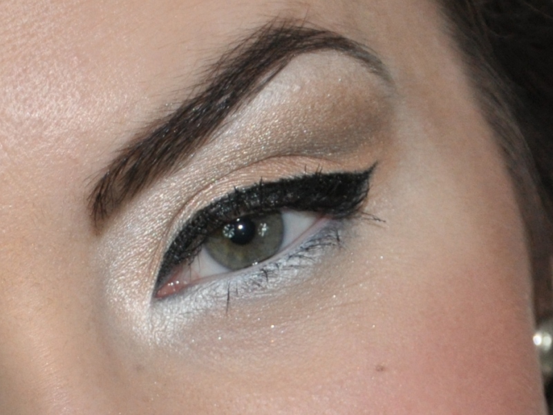 - Czarną kredką rysuję grubą linię powyżej rzęs – od zewnętrznej strony koniecznie musi być "wyciągnięta" w kierunku do skroni – po nadaniu kredką odpowiedniego kształtu linii – poprawiamy ją czarnym linerem.