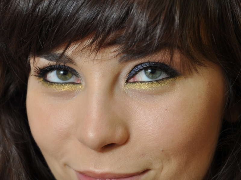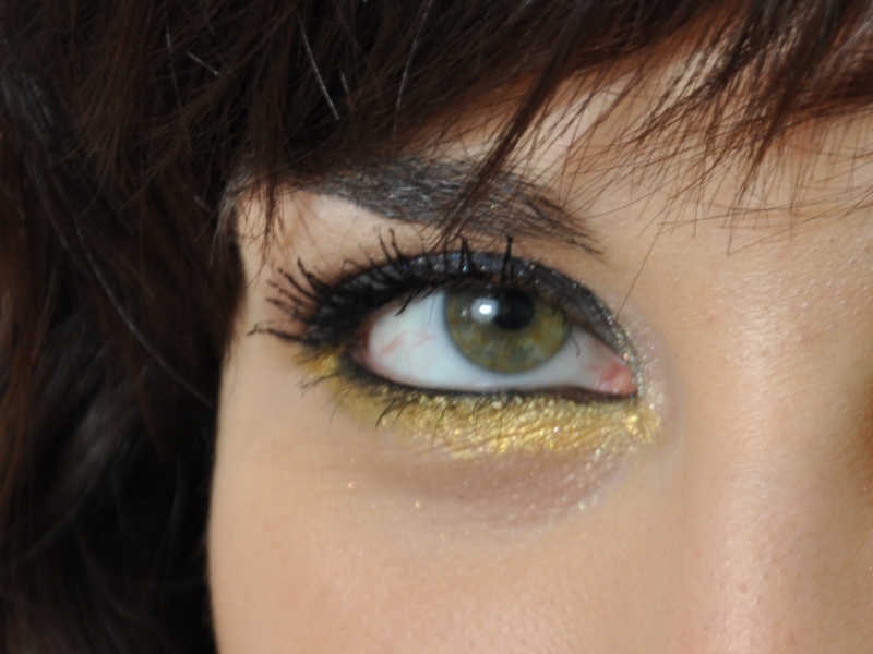 - Dolna powiekę, wzdłuż całej długości, podkreślam złotym cieniem w pyłku, a następnie poprawiam cieniem bardziej błyszczącym