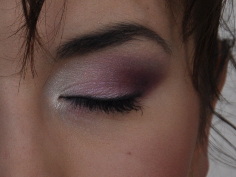 Tym samym przyciemniam go (dla uzyskania delikatnego makijażu można zrezygnować z tego elementu). - Cieniem burgundowym/ciemnym różowym rozcieram od zewnętrznej strony powieki ruchomej tzw. V.