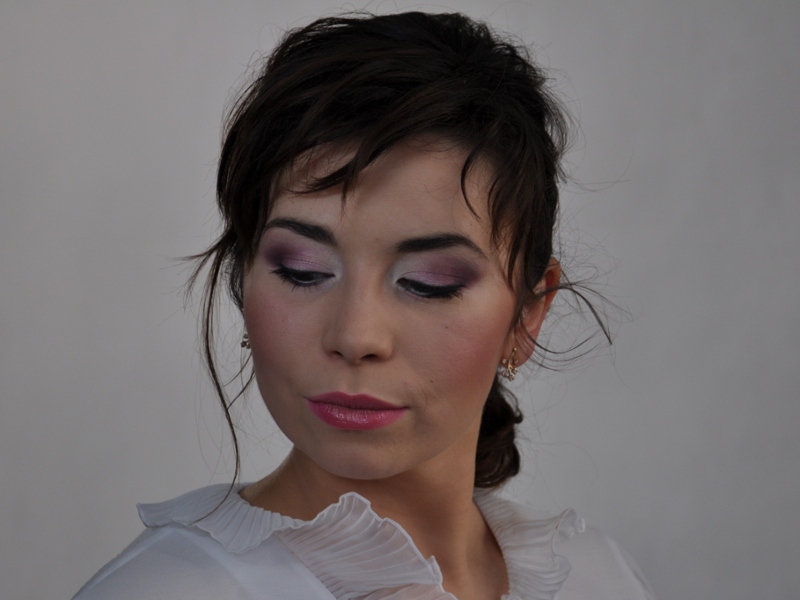 Produkty, które wykorzystałam w pierwszym etapie makijażu, możecie zobaczyć m.in. w nagraniu o " Trwałym makijażu ślubnym". Ważnym jest, aby odpowiednio przygotować twarz do makijażu - nie zapomnieć o nawilżeniu i o bazie pod makijaż, która znacznie przedłuży go. Nie zapominamy również o bazie pod cienie, bowiem na większe poprawki typu dokładanie cieni, nie będziemy mieć czasu. Makijaż uważam, że jest dość uniwersalny. Powinien pasować do większości osób. Jeśli macie małe oczy i zależy Wam na ich optycznym powiększeniu - zewnętrzną część makijażu rozetrzyjcie poza styczną z powieką ruchomą. Na niej zaś (powiece ruchomej) rozprowadźcie jasny odcień, najlepiej połyskujący (bowiem wszelkie drobinki, pryzmaty odbijające światło optycznie powiększają). Makijaż jest uniwersalny również pod innym względem - jeśli uznacie bowiem, że jest dla Was zbyt intensywny, zrezygnujecie po prostu z pierwszej fazy malowania cieniami - czyli z przyciemnienia zewnętrznej części oka cieniem ciemnym brązowym. Pozostałe elementy śmiało można wykonać i cieszyć się delikatnym, subtelnym podkreśleniem oka. Propozycja klasyczna i mam nadzieję przydatna.