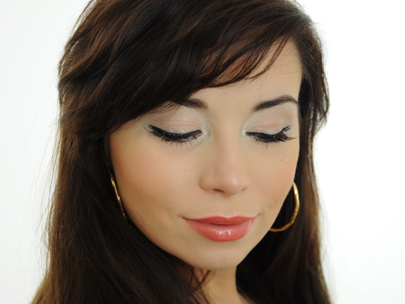 Kreski brokatowe wykonałam w kolorze jasnego złota, lekko mieniącego się na srebro. Jednakże w każdym kolorze, na tak neutralnym tle, będą prezentować się ciekawie i glamour . Dość istotnym wykończeniowym elementem makijażu są rzęsy. Samo wytuszowanie naszych naturalnych rzęs może okazać się niewystarczające. Dla uzyskania wieczorowego efektu dobrze jest dokleić sztuczne rzęsy na pasku, bądź tak jak ja - paru kępek rzęs , głównie od zewnętrznej strony. W przypadku ust jest pełna dowolność. Ja dobrze czuję się w ciepłych, lekko brzoskwiniowych pomadkach i nimi też przeciągnęłam usta. Dajcie znać co sądzicie o tej propozycji :) pozdrawiam, Monika
