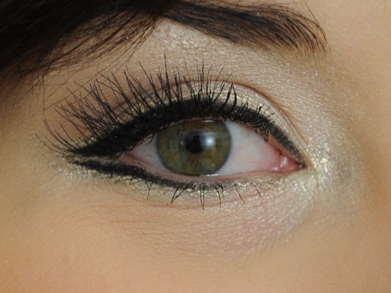 nie każdemu kojarzy się z przepychem i intensywnością w makijażu. Szczególnie osobom, które na co dzień nie malują się wcale, a na tą wyjątkową noc pragną jedynie w delikatny sposób podkreślić swoją urodę . Właśnie z myślą o tych osobach powstała niniejsza propozycja. Zaprezentowany poniżej makijaż bazuje na jasnych, rozświetlających kolorach, pięknie dodających uroku w sztucznym świetle. Głównymi jednak elementami, które w zasadzie tworzą ten look, są kreski narysowane czarnym eyelinerem wzdłuż całego oka. Ważne jednak, by kreska górna nie łączyła się z kreską dolną, a wręcz aby między nimi była wyraźna wolna przestrzeń. Kolejnym istotnym drobiazgiem jest równoległe poprowadzenie kresek. Wszystko to po to, aby ozdobne kreseczki wykonane brokatowym eyelinerem, prezentowały się nienagannie - naniesione w bezpośrednim sąsiedztwie kresek czarnych.