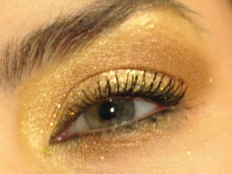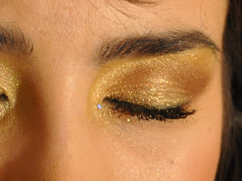 - Aplikujemy brokat (oczywiście złoty;) na ruchomej cz.powieki; by lepiej się przytrzymał uprzednio nałożyłam na powiekę cień w musie.