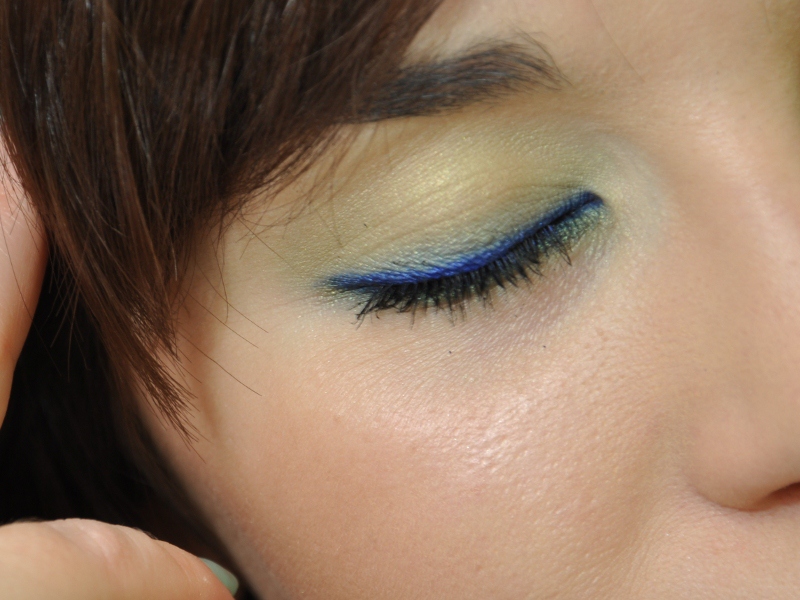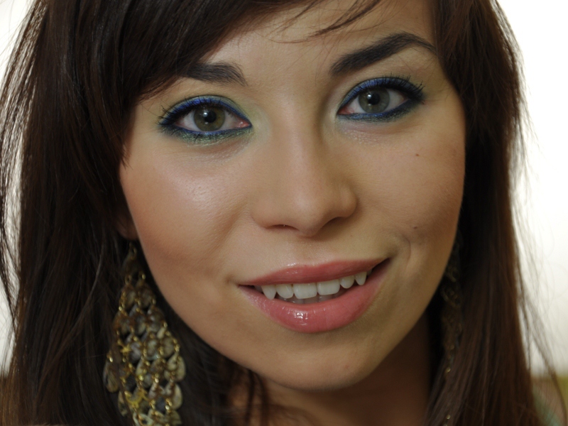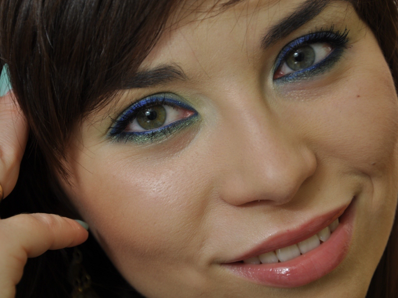 - Zielony cień aplikuję zwilżonym pędzelkiem na powiece ruchomej. Tym samym cieniem rozjaśniam lekko kreskę zielona na powiece dolnej.