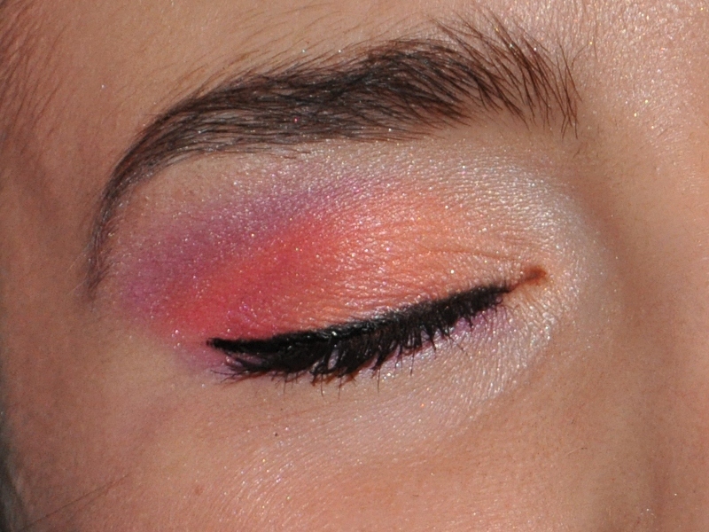 - Ciemniejszy cień łososiowy (brzoskwiniowy) aplikuję od zewnętrznej części powieki. Wyciągam kolor lekko ku górze oraz kierując się troszeczkę-w załamaniu powieki-do wewnętrznej części oka.