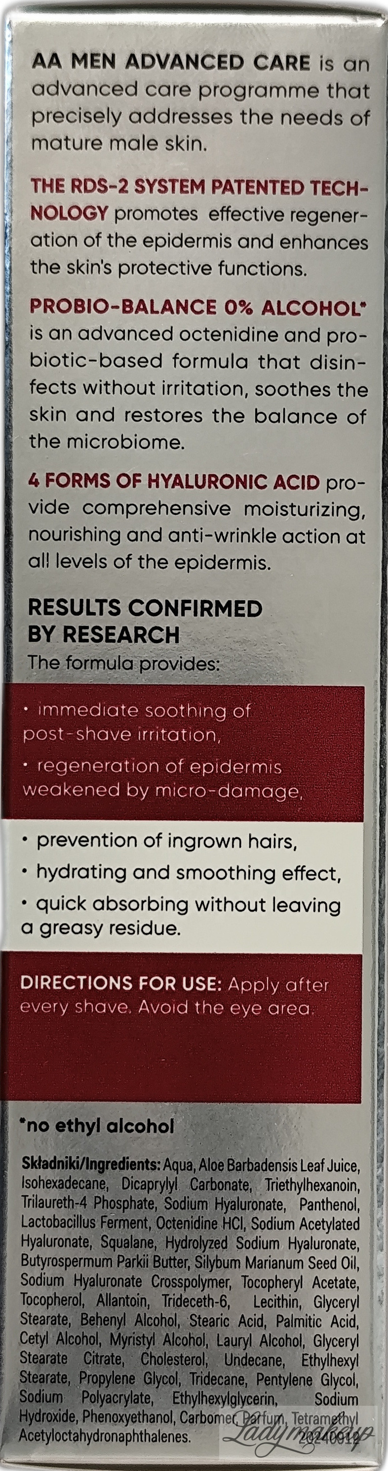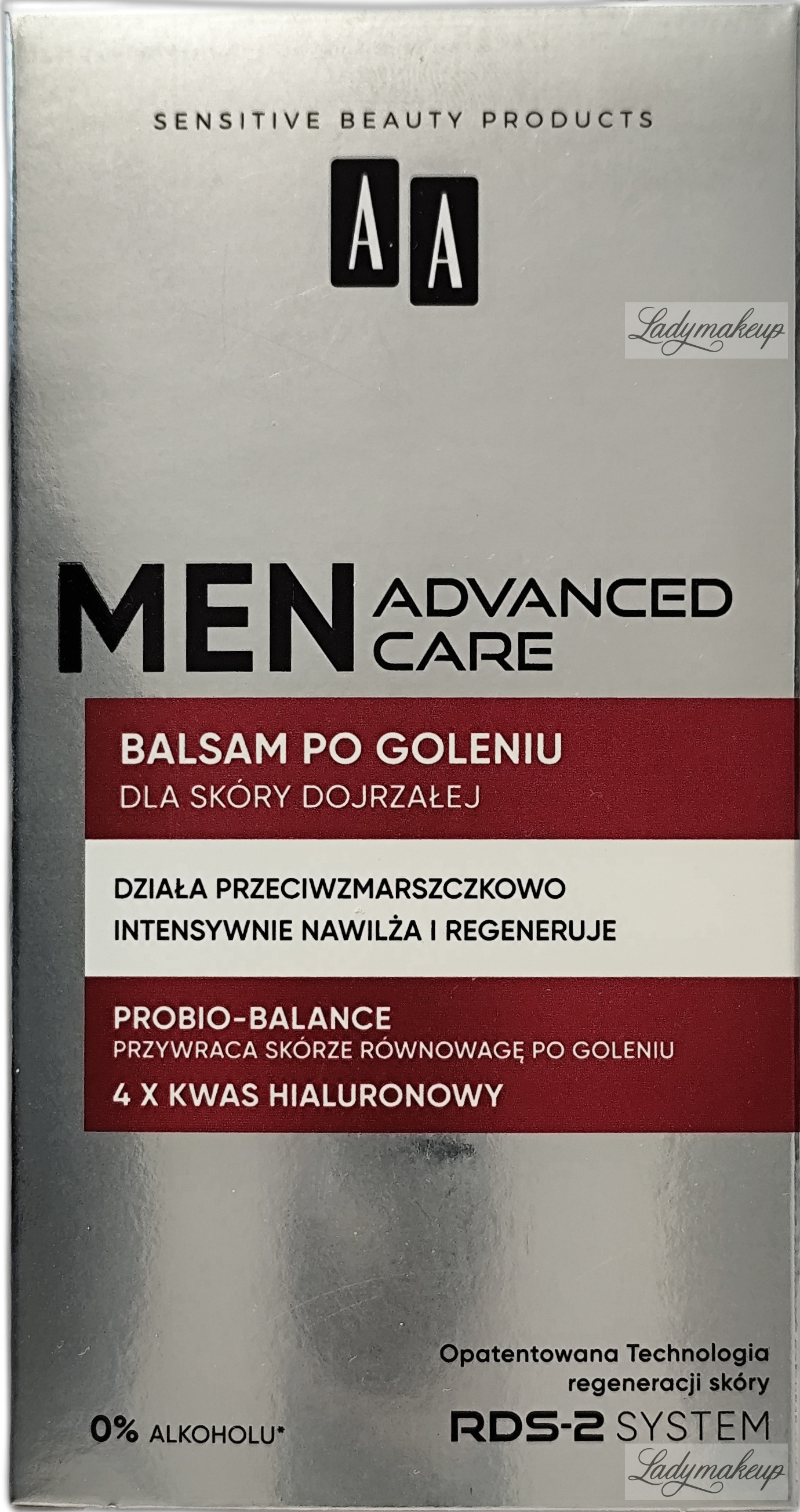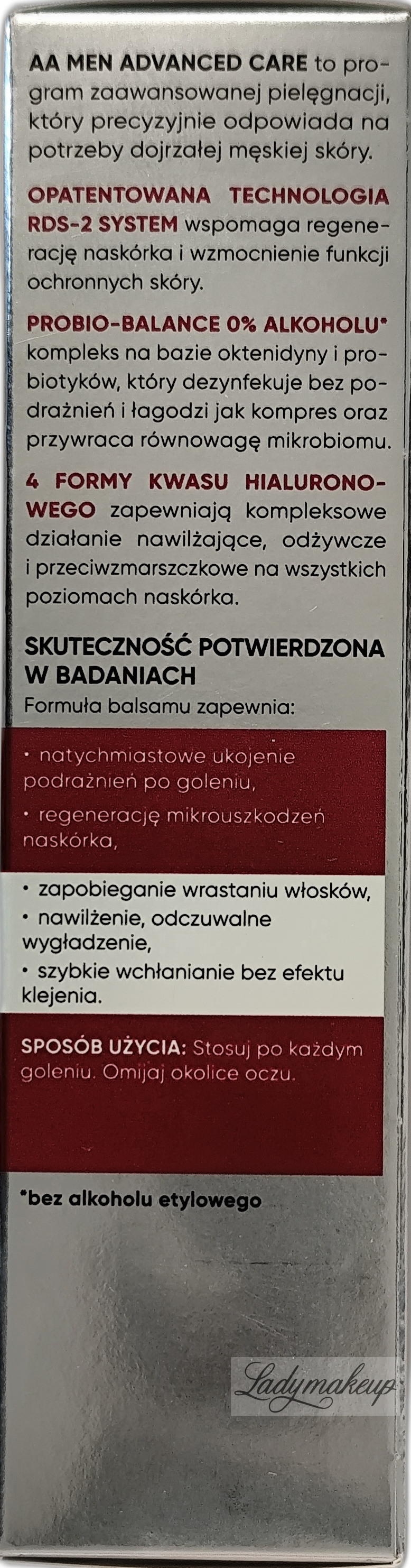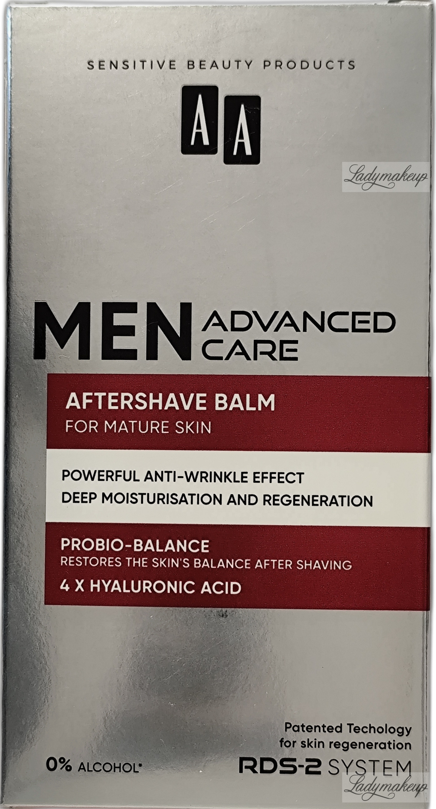 Balsam po goleniu. Został stworzony specjalnie z myślą o pielęgnacji męskiej skóry dojrzałej oraz wrażliwej. Lekka formuła, bez dodatku alkoholu etylowego nie podrażnia, nie przesusza, za to szybko się wchłania bez uczucia lepkości i tłustości na skórze. Zawiera w sobie 4 formy kwasu hialuronowego, a także specjalny kompleks Probio-balance na bazie oktenidyny i probiotyków. Balsam AA natychmiastowo koi i łagodzi podrażnienia, przynosi skórze ukojenia, a także wspomaga regenerację mikrouszkodzeń naskórka. Dodatkowo dobrze nawilża, redukuje oznaki zmęczenia, odmładza, wygładza oraz poprawia elastyczność skóry. AA balsam dostępny jest w opakowaniu o pojemności 100 ml.