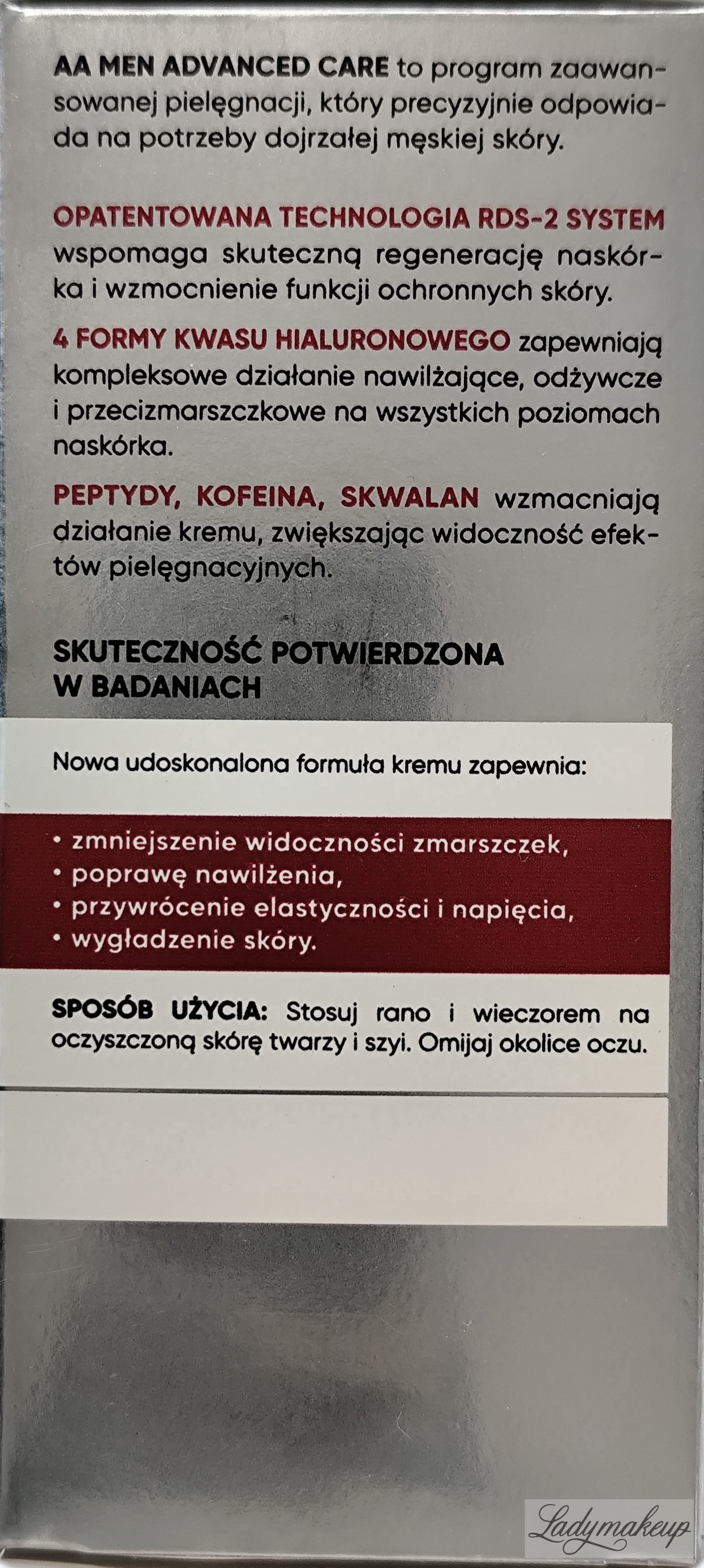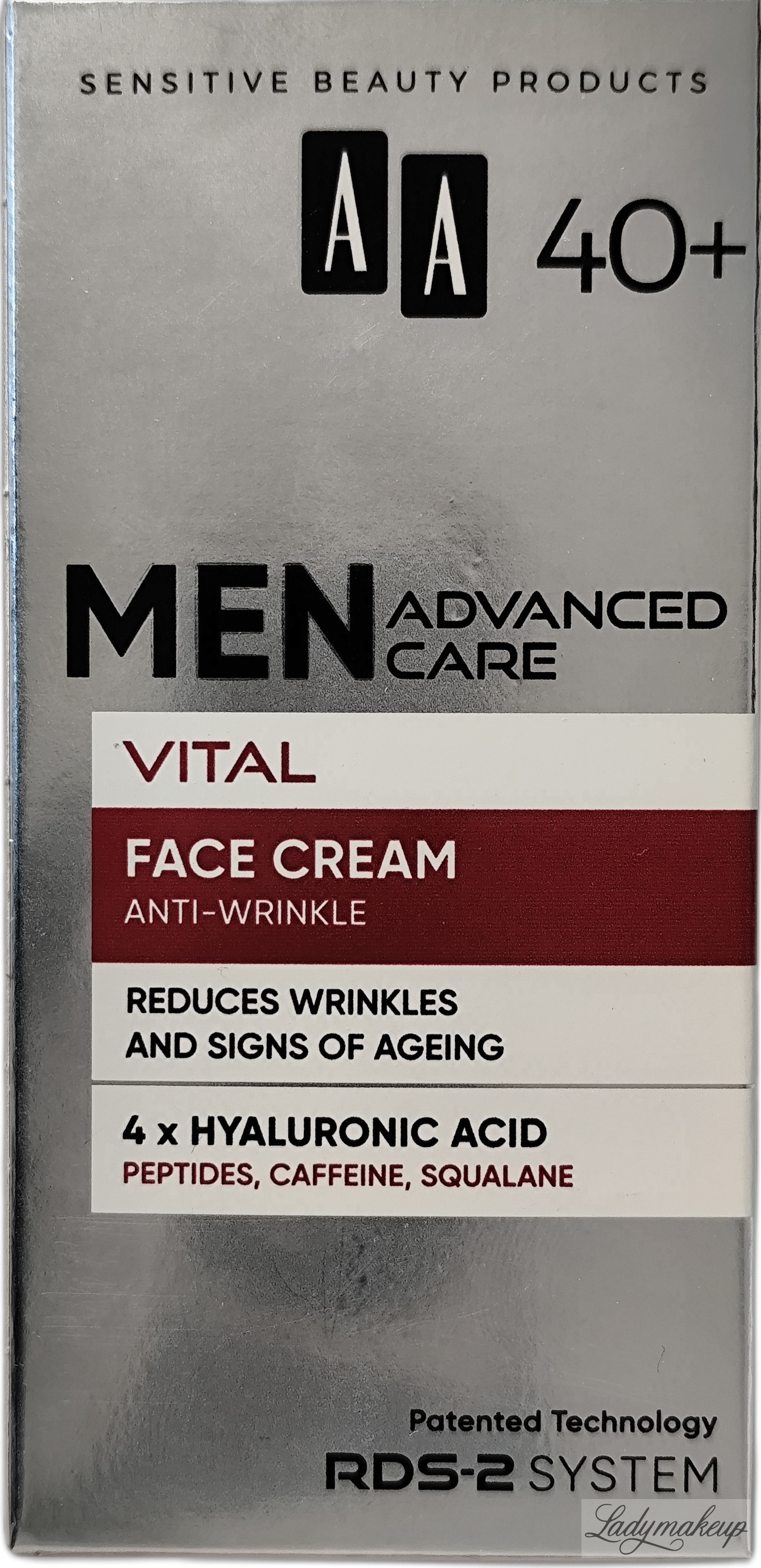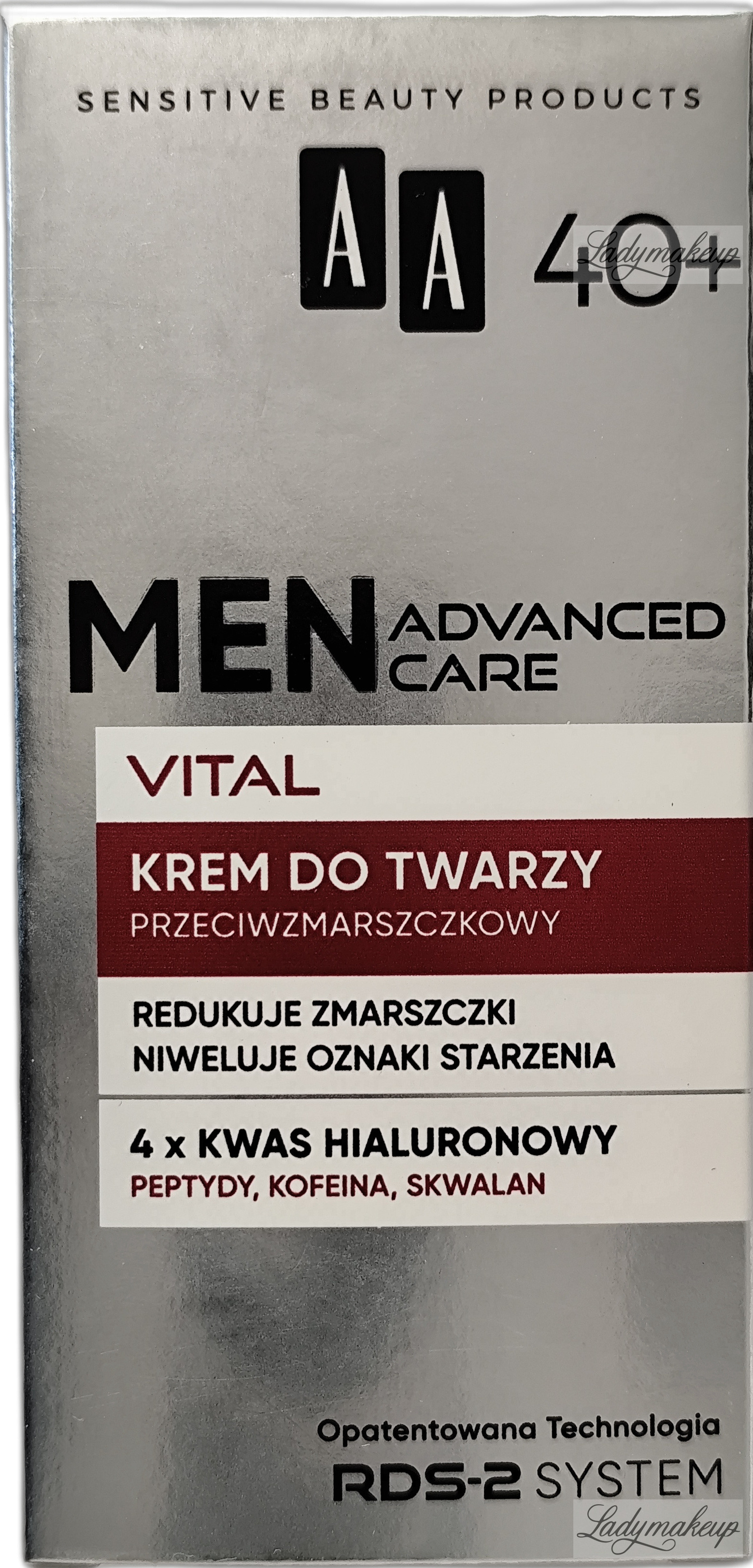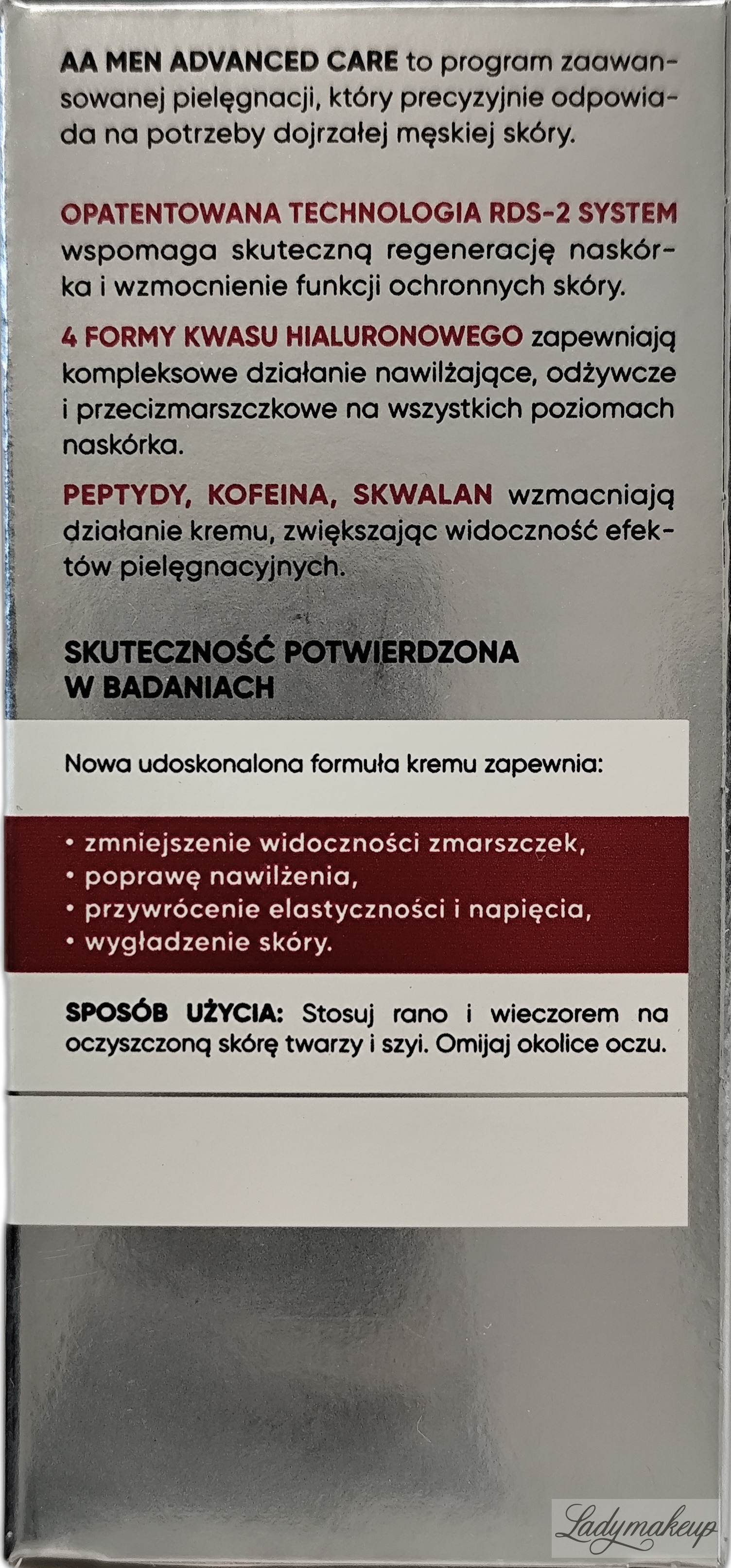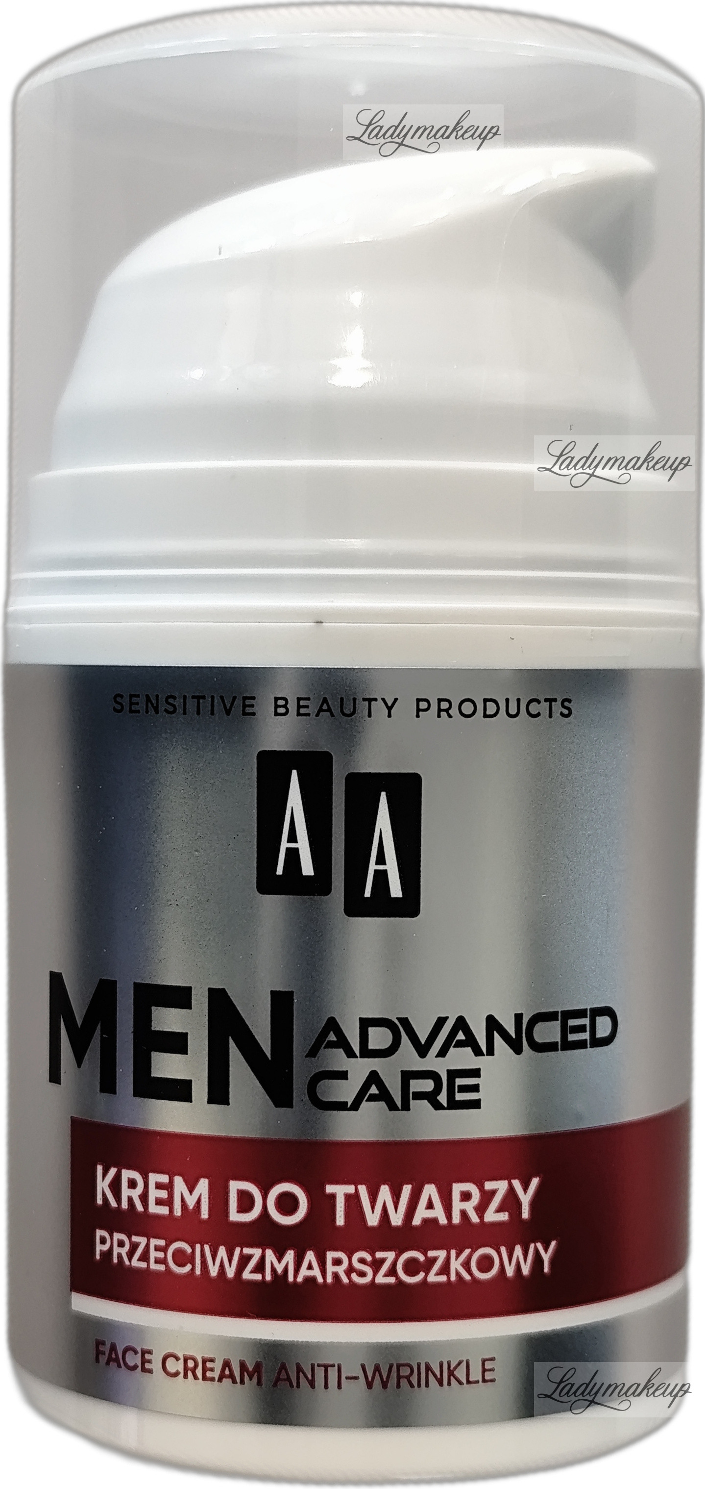 Krem do twarzy. Przeznaczony jest do codziennej rannej i wieczornej pielęgnacji skóry dojrzałej, mężczyzn w wieku 40+. Jest w 100% wegański i nietestowany na zwierzętach. Zawiera w sobie specjalnie wyselekcjonowane składniki aktywne takie jak m.in.: peptydy, kofeina, skwalan oraz 4 formy kwasu hialuronowego. Skutecznie zmniejsza widoczność zmarszczek, przywraca cerze elastyczność oraz napięcie, a także wzmacnia funkcje ochronne skóry. Ponadto krem AA doskonale i dogłębnie nawilża i odżywia, a także pobudza skórę do znacznie szybszej regeneracji. Kosmetyk dostępny jest w opakowaniu o pojemności 50 ml.
