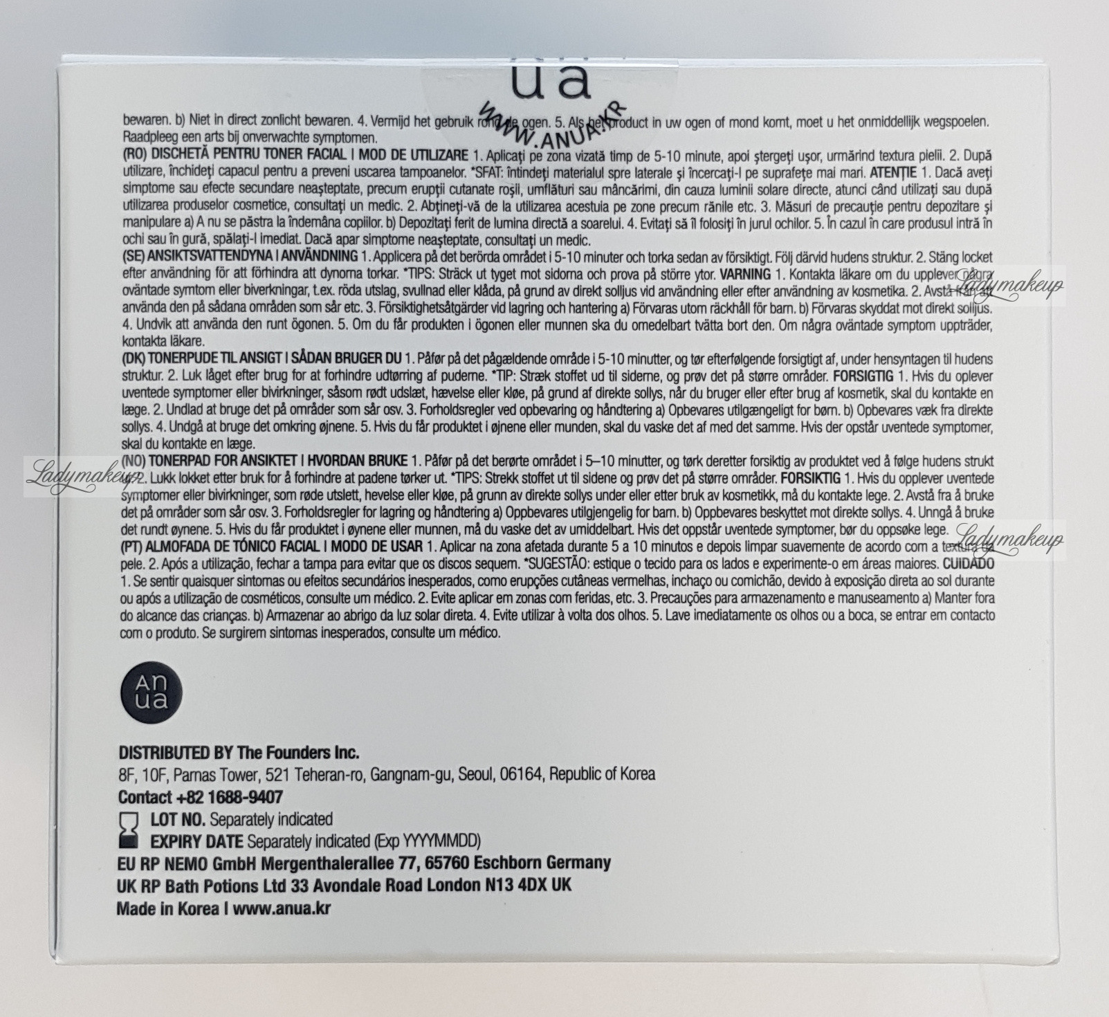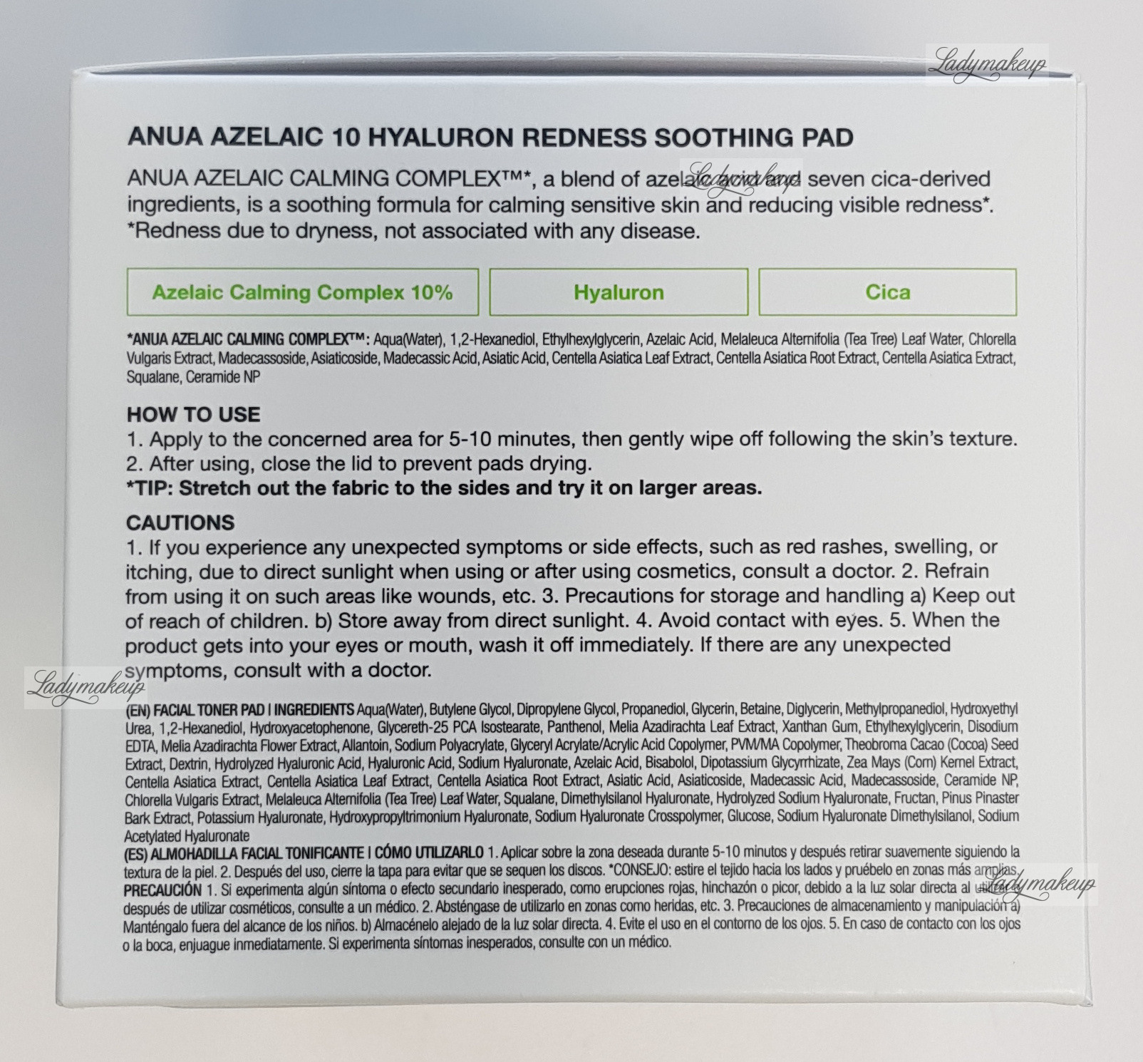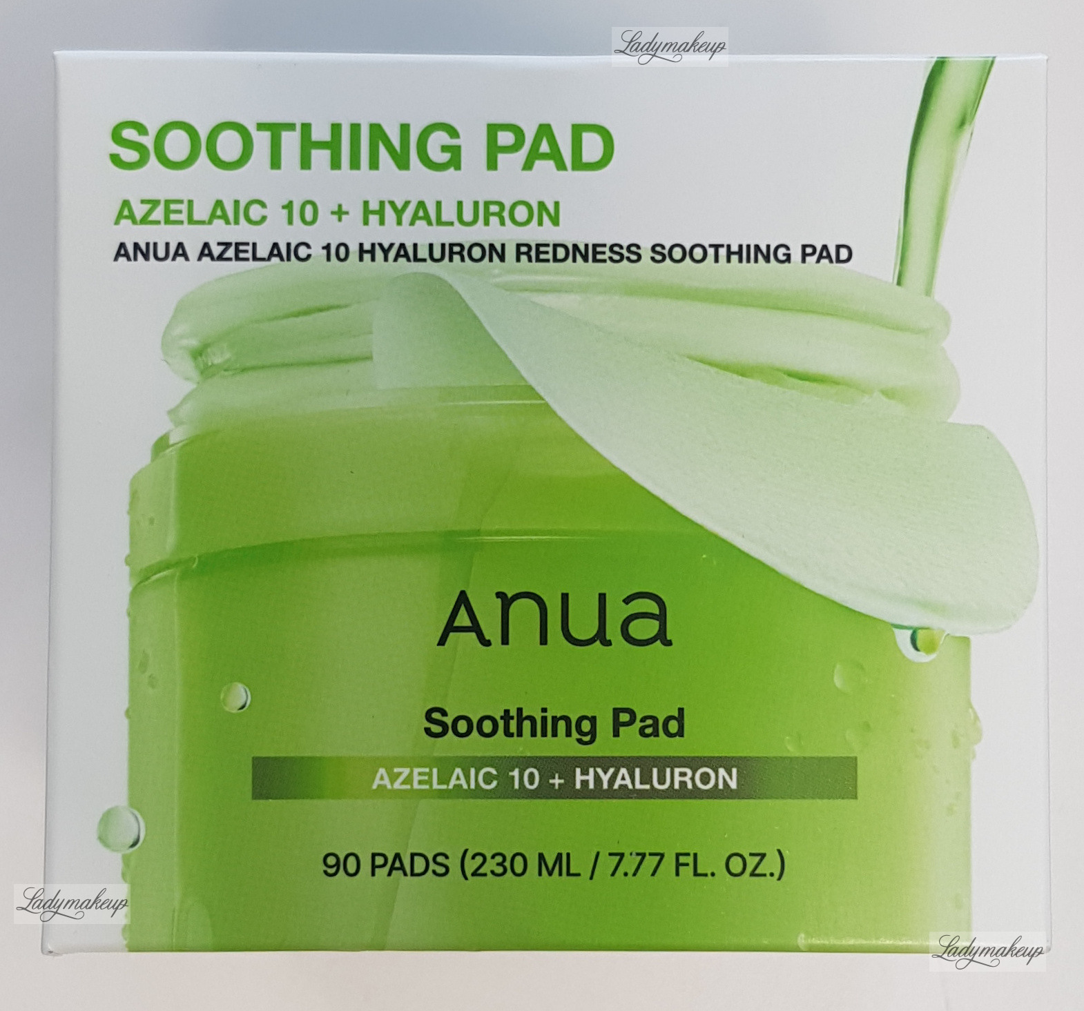 Płatki do twarzy. Skierowane są do pielęgnacji skóry każdego rodzaju, w szczególności suchej oraz podrażnionej. Zawierają w sobie specjalnie wyselekcjonowane składniki aktywne takie jak: kwas azelainowy, kwas hialuronowy oraz wąkrotka azjatycka. Płatki Anua natychmiastowo koją i łagodzą podrażnienia oraz intensywnie i długotrwale nawilżają. Dodatkowo dogłębnie odżywiają naskórek, poprawiają kolor i teksturę skóry, a także zapobiegają odwodnieniu i utracie elastyczności i napięcia naskórka. Delikatnie złuszcza martwy naskórek, a także poprawia koloryt oraz teksturę skóry. W opakowaniu znajduje się 90 sztuk płatków do twarzy.