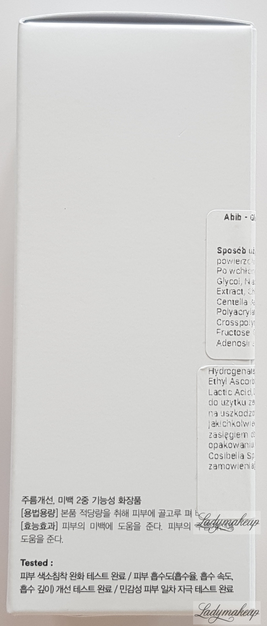 Serum na twarz. Przeznaczone do codziennej pielęgnacji skóry każdego rodzaju, w tym również o nierównym kolorycie, tłustej oraz trądzikowej. Swoje dobroczynne działanie opiera na bazie dobroczynnych składników aktywnych takich jak: niacynamid, witamina C, ekstrakt z wąkroty azjatyckiej, glutation, kwas ferulowy oraz ceramid NP. Regularnie stosowane serum Abib widocznie redukuje ilość przebarwień, wyrównuje koloryt cery oraz nadaje skórze zdrowego blasku. Jednocześnie reguluje wydzielanie sebum, a także działa antyoksydacyjnie i przeciwstarzeniowo. Abib serum dostępne jest w opakowaniu o pojemności 50 ml. Kosmetyk nie zawiera w sobie żadnych kompozycji zapachowych.