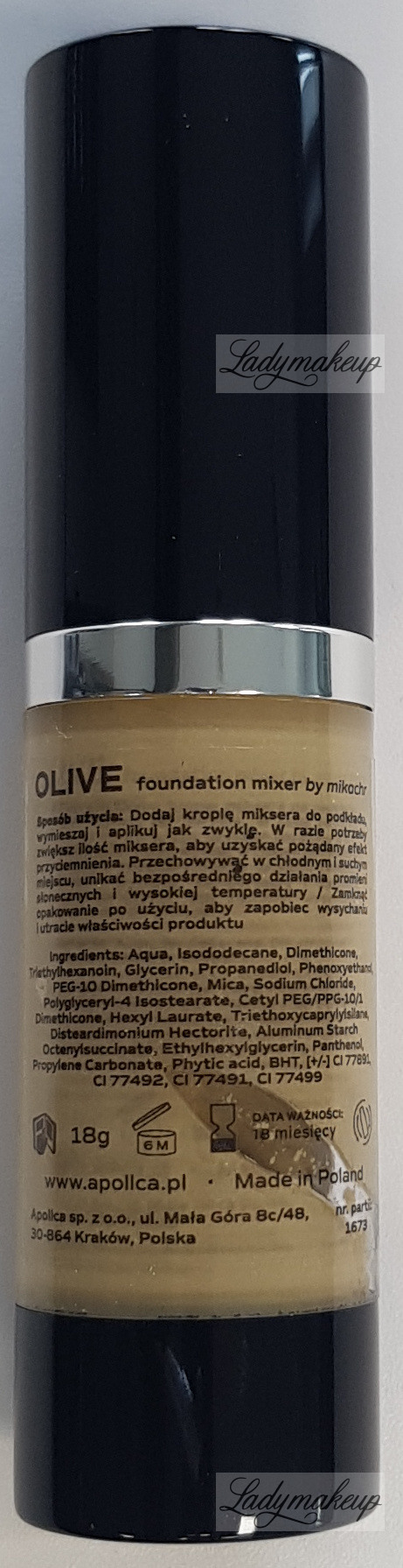 Mikser do podkładu i korektora. Przeznaczony do mieszania z podkładem. Idealnie sprawdzi się w sytuacjach, kiedy kupimy zbyt ciemny podkład, bądź też w sytuacji kiedy używany wcześniej fluid już nam nie pasuje. To również zbawienne rozwiązanie kiedy po prostu nigdy nie mogłaś znaleźć odcienia podkładu idealnego do swojej karnacji. Po co się męczyć? Stwórz go sama! Mikser Apollca ma delikatną kremową formułę, która dobrze łączy się z podkładami o różnych strukturach, przy jednoczesnym nie zmienianiu ich właściwości aktywnych, trwałości czy nawet konsystencji. Wersja Olive została stworzona z myślą o karnacjach o oliwkowych bądź ziemistych podtonach. Apollca mikser skutecznie neutralizuje zbyt różowe lub żółte odcienie podkładów. Kosmetyk dostępny jest w opakowaniu o pojemności 18 g.