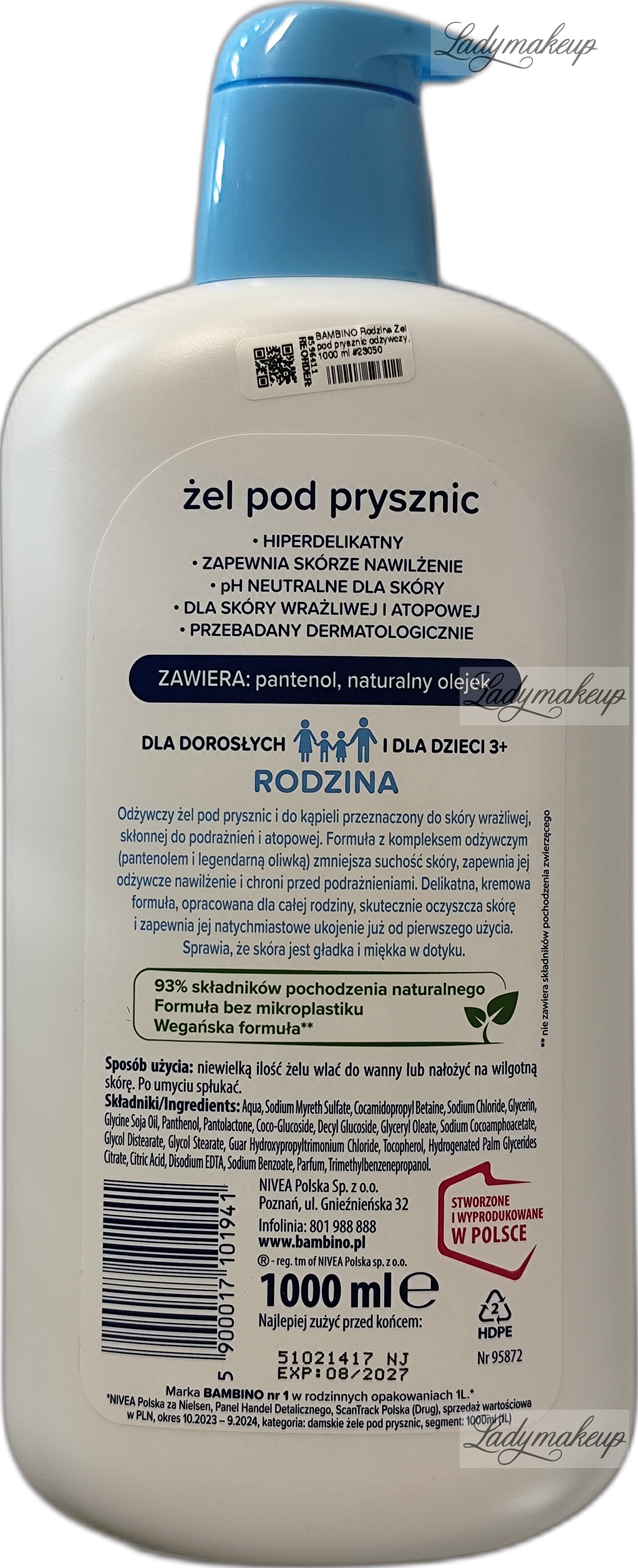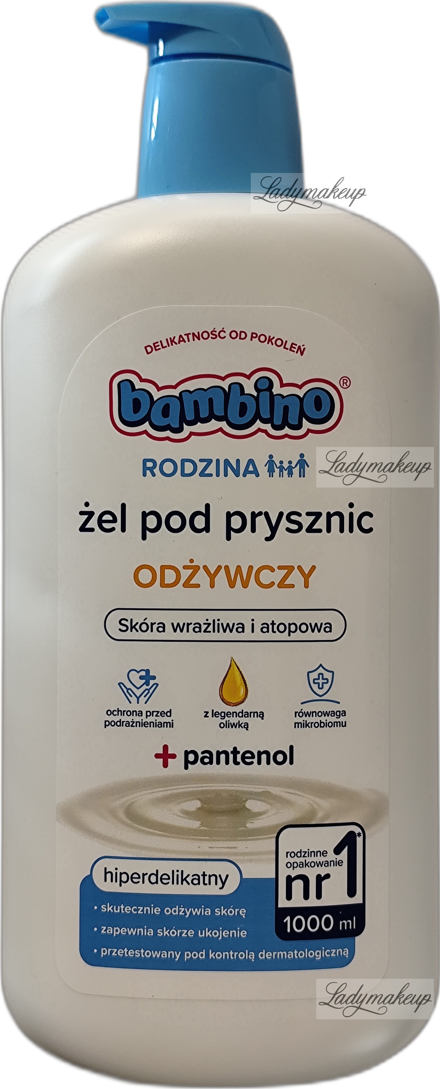 Przeznaczony dla pielęgnacji skóry wrażliwej oraz atopowej. Doskonale sprawdzi się zarówno dla osób dorosłych oraz dzieci powyżej 3 roku życia. Żel Bambino łagodnie myje oraz oczyszcza całe ciało z wszelkich zanieczyszczeń oraz brudu, bez wywoływania podrażnień i przesuszenia naskórka. W swoim składzie zawiera specjalnie wyselekcjonowane składniki aktywne takie jak m.in.: panthenol i oliwkę Bambino, które aktywnie pielęgnują oraz dbają o dobrostan naskórka. Bambino żel intensywnie nawilża, dogłębnie odżywia, a przy tym zmiękcza oraz wygładza naskórek. Kosmetyk dostępny jest w sporym, rodzinnym opakowaniu o pojemności 1000 ml, które starczy na bardzo długi czas.