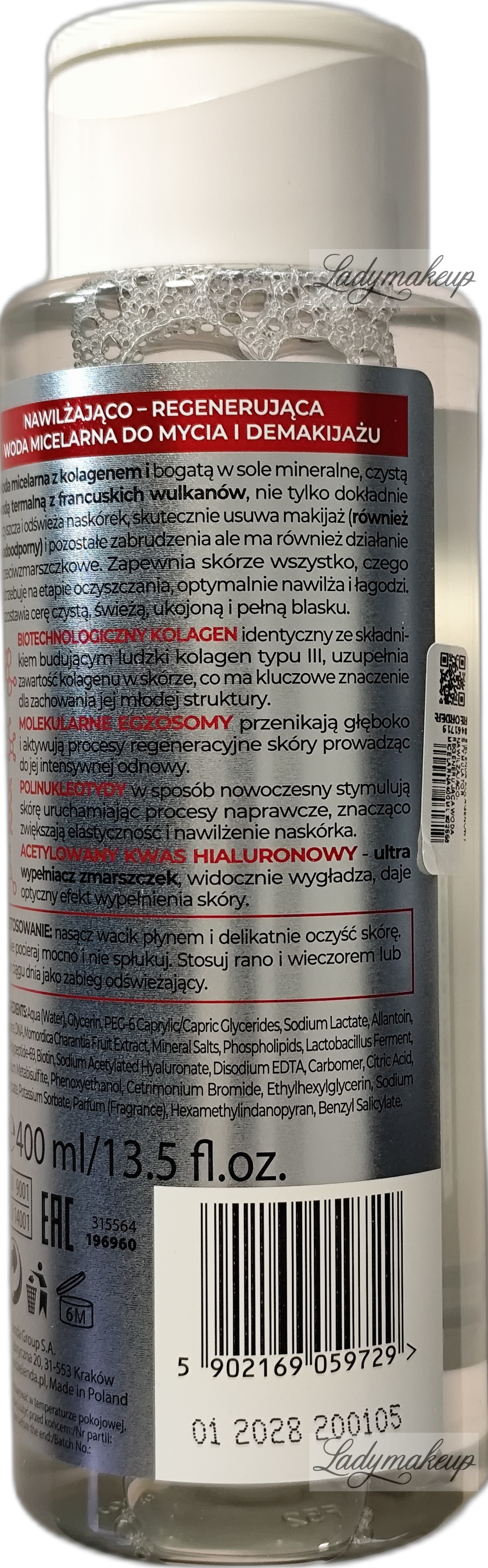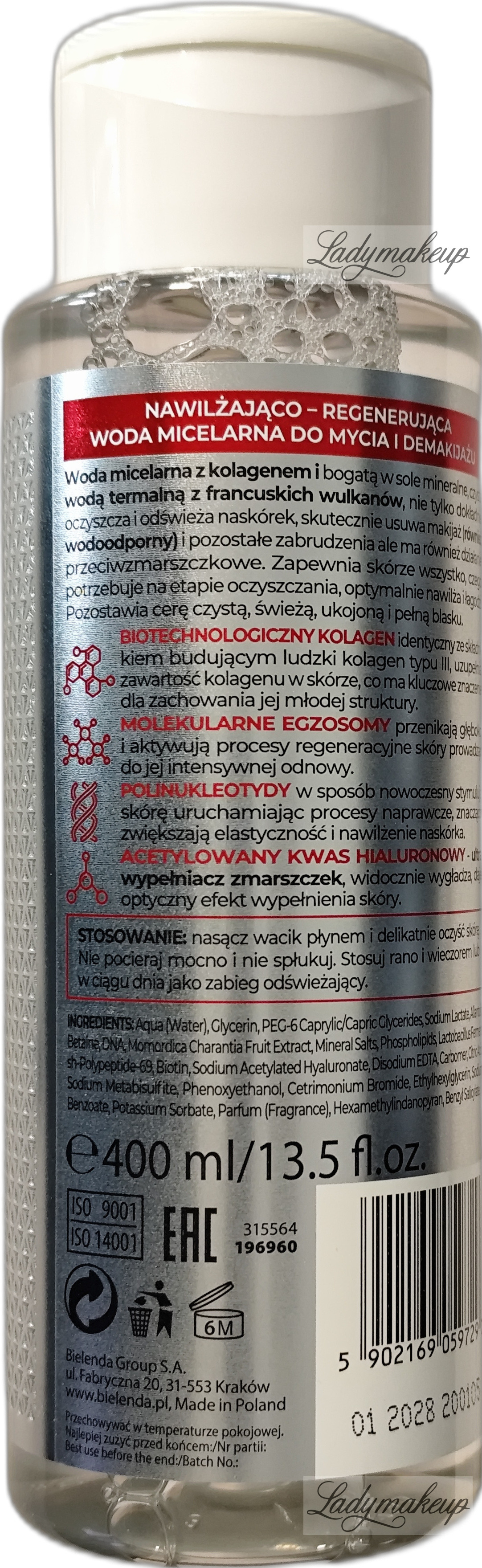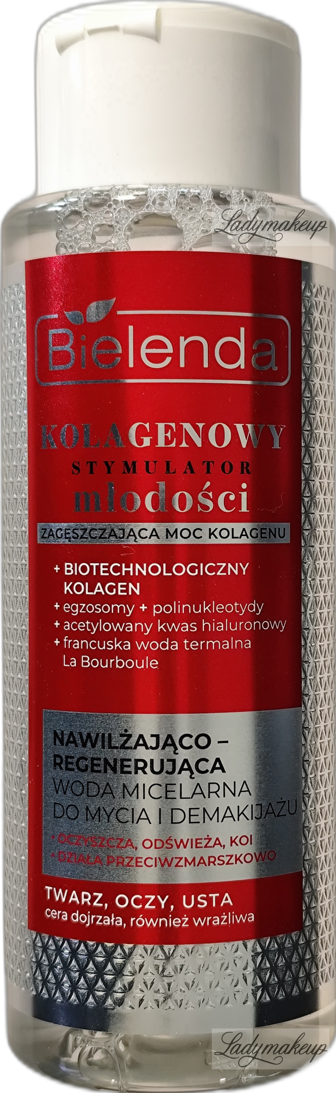 Został stworzony specjalnie z myślą o skórze dojrzałej oraz wrażliwej. W swoim składzie zawiera w sobie kluczowe składniki aktywne, takie jak: biotechnologiczny kolagen, molekularne egzosomy, polinukleotydy, acetylowany kwas hialuronowy oraz francuską wodę termalną La Bourboule. Skutecznie oczyszcza skórę z zanieczyszczeń, a także dobrze zmywa makijaż (nawet wodoodporny) twarzy, oczu oraz ust, bez wywoływania podrażnień. Bielenda woda micelarna intensywnie nawilża, dogłębnie odżywia oraz regeneruje naskórek. Dodatkowo wygładza drobne linie i zmarszczki, a także przywraca skórze miękkość, gładkość oraz elastyczność. Woda micelarna Bielenda dostępna jest w butelce o pojemności 400 ml.