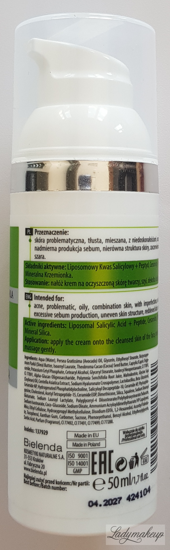 Krem do twarzy. Został stworzony specjalnie z myślą o skórze problematycznej, tłustej, mieszanej, o nierównym kolorycie oraz o rozszerzonych porach. Swoje działanie opiera na bazie specjalnie wyselekcjonowanych składników aktywnych takich jak: liposomowy kwas salicylowy, peptyd, ceramidy, prebiotyki, CICA (wąkrota azjatycka) oraz mineralna krzemionka. Krem Bielenda Professional o formule BB, dzięki pigmentowi natychmiastowo maskuje wszelkie zaczerwienienia, tym samym wyrównując koloryt, zmniejsza wydzielanie sebum, a także matuje na długi czas. Bielenda Professional krem dostępny jest w opakowaniu o pojemności 50 ml.