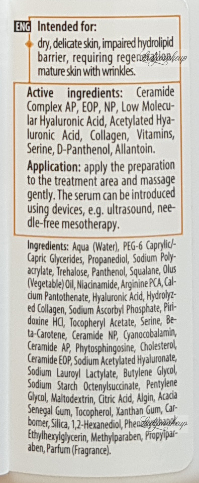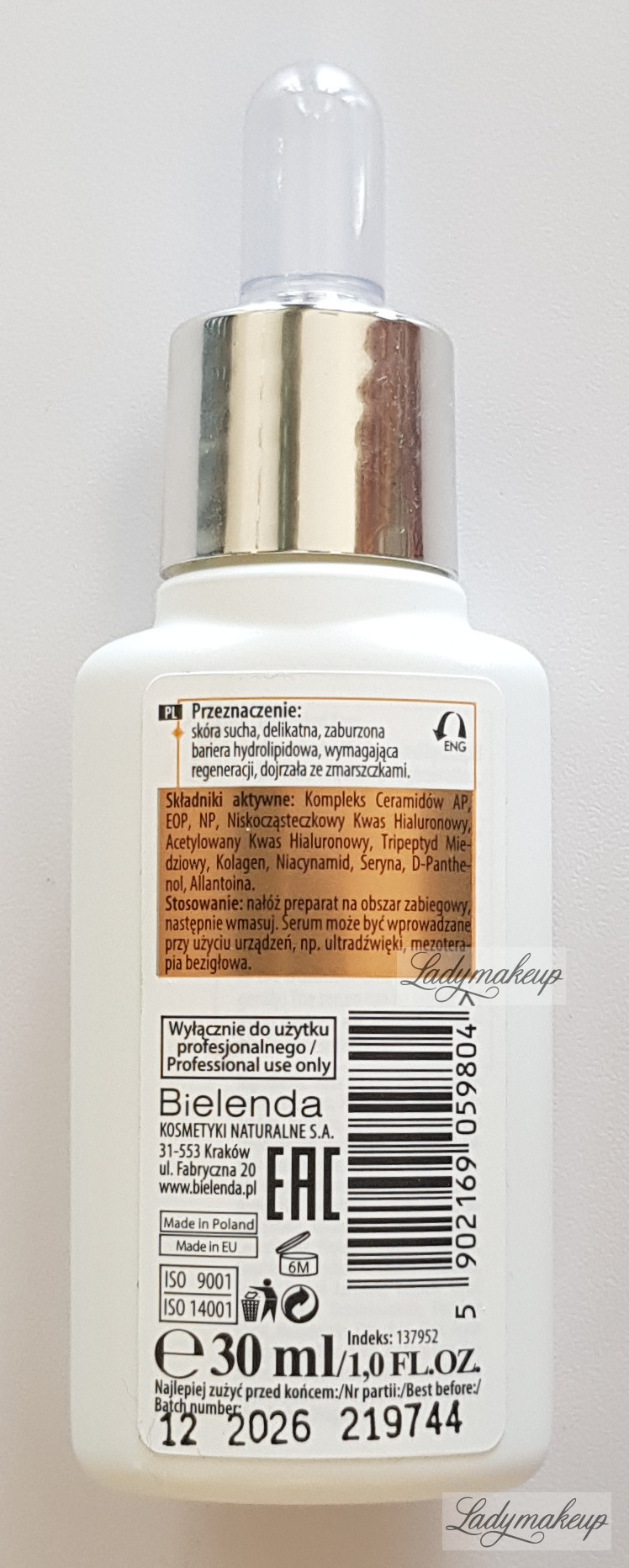 Serum do twarzy. Pochodzi z serii Lipid Care, która została stworzona specjalnie z myślą o skórze suchej, odwodnionej, dojrzałej a także z zaburzoną barierą hydrolipidową. Zawiera w sobie specjalnie wyselekcjonowane składniki aktywne takie jak m.in.: kompleks ceramidów AP, EOP, NP, kwas hialuronowy, tripeptyd miedziowy, kolagen, niacynamid, seryna, D-panthenol oraz alantoina. Serum Bielenda Professional intensywnie odżywia, dobrze nawilża, łagodzi i koi podrażnienia, a także pobudza skórę do znacznie szybszej regeneracji. Dodatkowo poprawia elastyczność i jędrność skóry oraz wzmacnia barierę hydrolipidową. Bielenda Professional serum dostępne jest w opakowaniu o pojemności 30 ml.