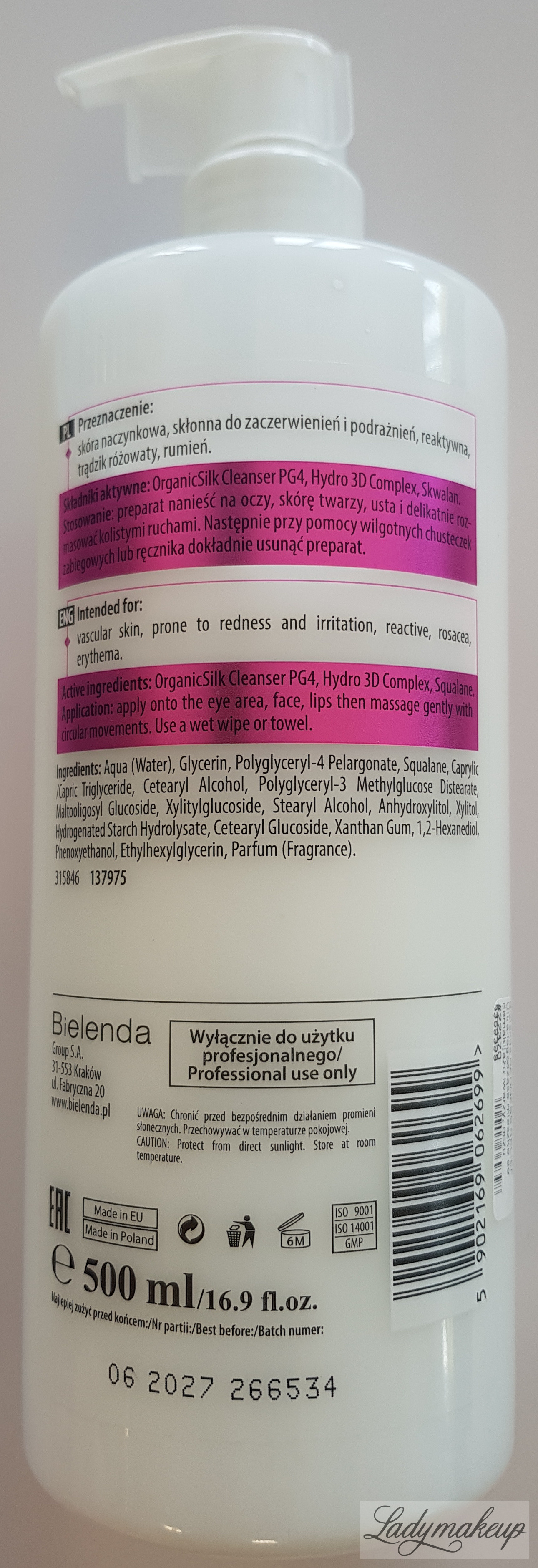 Mleczko do demakijażu twarzy i oczu. Przeznaczone do pielęgnacji skóry naczynkowej, reaktywnej, skłonnej do zaczerwienień i podrażnień oraz z trądzikiem różowatym oraz rumieniem. Zawiera w sobie specjalnie wyselekcjonowane składniki aktywne takie jak: skwalan oraz kompleksy OrganicSilk i Hydro3D. Dokładnie ale jednocześnie delikatnie usuwa nawet mocny makijaż oraz oczyszcza z zanieczyszczeń i sebum, bez wywoływania podrażnień i przesuszenia skóry. Dodatkowo mleczko Bielenda Professional łagodzi i koi podrażnienia, wycisza zaczerwienienia, wzmacnia naczynia krwionośne i redukuje objawy rumienia, przywraca uczucie komfortu, a także regeneruje. Kosmetyk dostępny jest w butelce o pojemności 500 ml z pompką dozującą odpowiednią ilość produktu.
