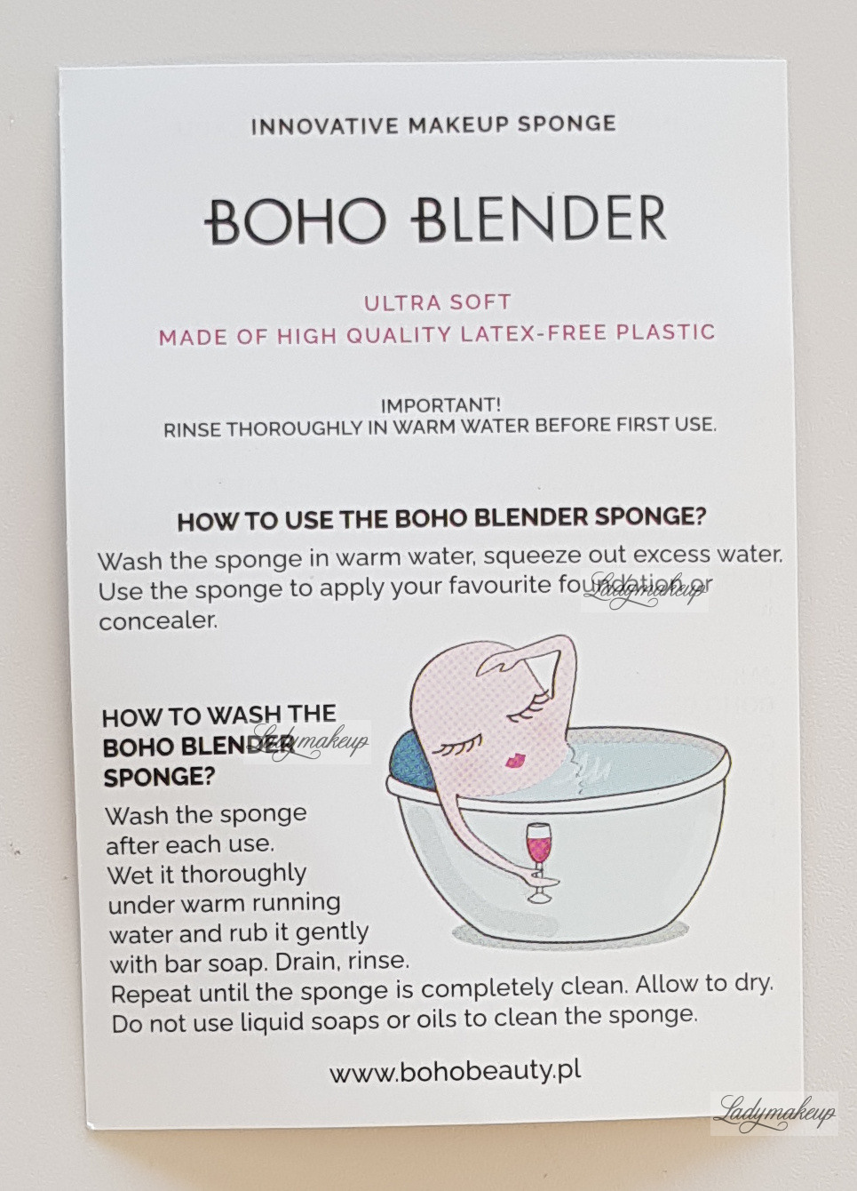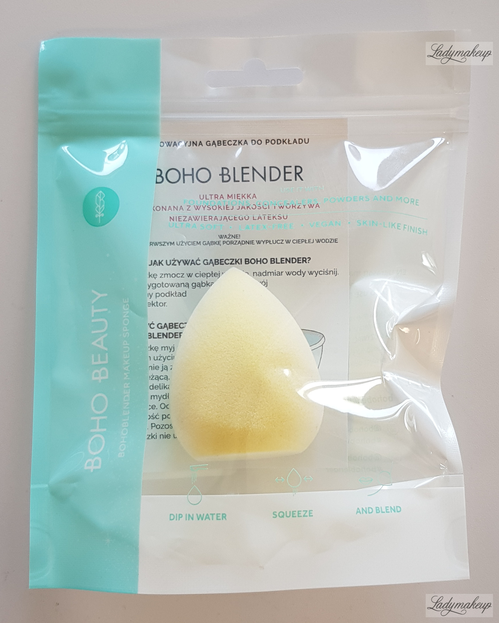 Gąbka do makijażu. Jest w 100% wegańska. Posiada klasyczny kształt jajeczka z lekko ściętym jednym bokiem oraz płaską podstawą. Wykonana została w całości z miękkiej mikrofibry, która w dotyku przypomina miękki welurowy, lekko włoskowaty materiał. Gąbka Boho Beauty doskonale aplikuje oraz wtapia kosmetyki w pory skóry, dając znacznie większe krycie niż tradycyjna gąbka do makijażu. Poradzi sobie z aplikacją wielu różnych kolorowych kosmetyków, takich jak np. podkład , korektor czy puder. Boho Beauty gąbka nie zawiera w sobie lateksu. Zachwyca świeżym, jasnym odcieniem cytrynowej żółci.