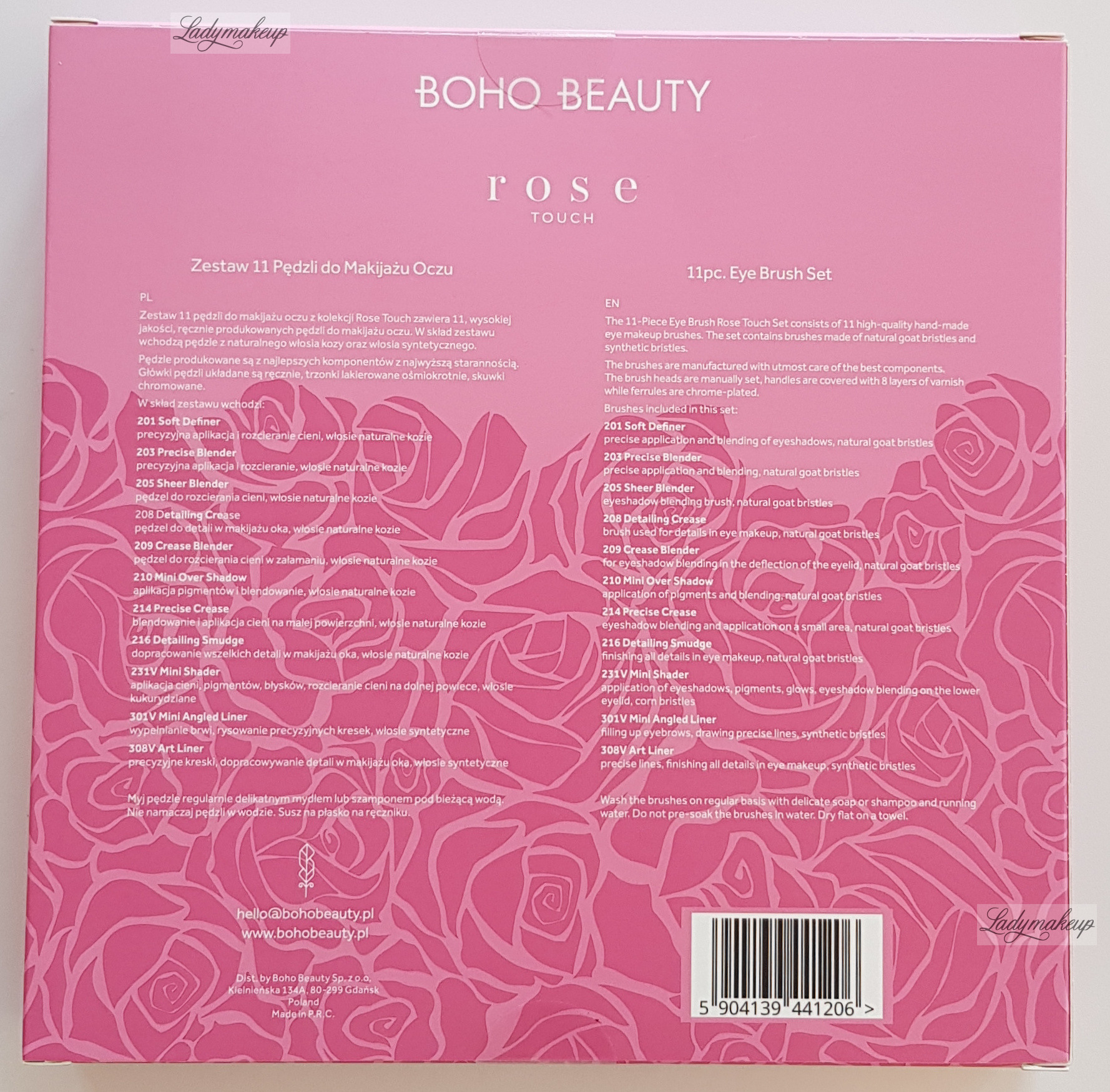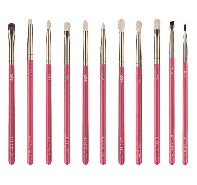 Zestaw pędzli do makijażu. Umożliwia sprawne i bezproblemowe wykonanie każdego makijażu oczu. Make-up wykonany takimi pędzlami będzie prezentował się perfekcyjnie i kusząco w każdej sytuacji. W zależności od modelu pędzle zostały wykonane z wegańskiego włosia kukurydzianego, naturalnego włosia koziego czy włosia syntetycznego. To doskonały zestaw pędzli do makijażu zarówno dla profesjonalistów, jak i amatorów sztuki makijażu. Zestaw Boho Beauty Rose Touch został zapakowany w eleganckie opakowanie w odcieniu malinowego różu, dzięki czemu idealnie sprawdzi się jako prezent dla siebie lub bliskiej osoby.