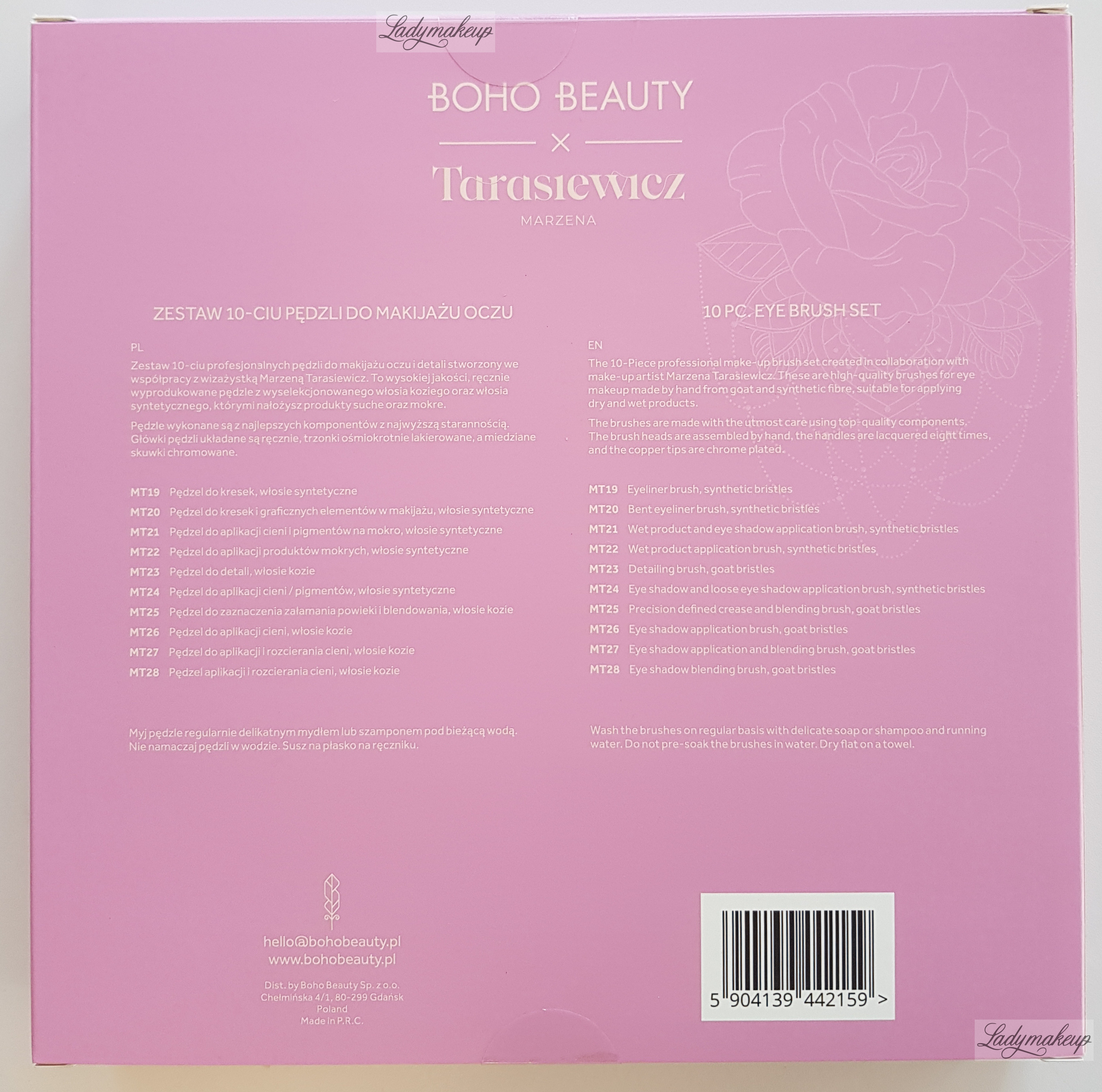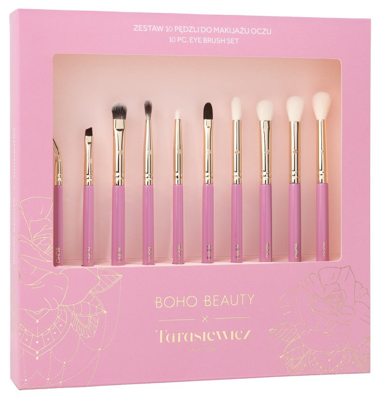 Zestaw pędzli do makijażu oczu. Pochodzi ze specjalnej serii która powstała przy współpracy ze znaną wizażystką Marzeną Tarasiewicz. Umożliwia sprawne i bezproblemowe wykonanie każdego makijażu twarzy oraz oczu. Make-up wykonany takimi pędzlami będzie prezentował się perfekcyjnie i kusząco. W zależności od modelu pędzle zostały wykonane z naturalnego włosia koziego oraz włosia syntetycznego. To doskonały zestaw pędzli do makijażu zarówno dla profesjonalistów, jak i amatorów sztuki makijażu. Zestaw Boho Beauty został zapakowany w eleganckie, stylowe opakowanie w odcieniach jasnego różu i fioletu, dzięki czemu idealnie nada się na prezent dla siebie lub bliskiej osoby.