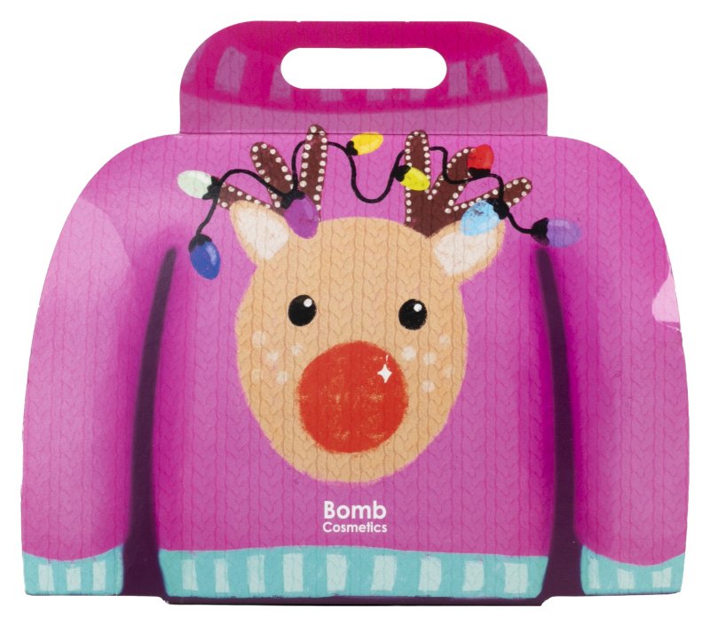 Zestaw prezentowy. Został zapakowany w gustowne i niezwykle klimatyczne papierowe opakowanie ze świątecznym nadrukiem, kształtem przypominającym świąteczny sweterek. Zestaw Bomb Cosmetics w środku zawiera 2 pełnowymiarowe kosmetyki pielęgnacyjne, tj. kule do kąpieli oraz mydło do rąk i ciała. Kula Bomb Cosmetics po dodaniu do wody rozkosznie musuje oraz roztacza wokół siebie kuszącą i relaksującą nutę, zaś dobroczynne składniki sprawiają, że po użyciu ciało jest wypielęgnowane. Mydełko dobrze się pieni i łagodnie oczyszcza skórę, bez jej przesuszania. Bomb Cosmetics zestaw doskonale sprawdzi się jako prezent gwiazdkowy dla bliskiej osoby, która lubi kąpiele i relaks.