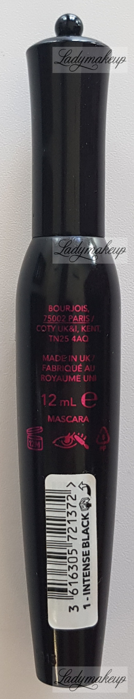 Tusz do rzęs. Posiada dobrze napigmentowaną intensywnie czarną formułę, która pięknie podkreśla spojrzenie oraz cudnie definiuje oprawę oczu. Dodatkowo zapewnia efekt maksymalnej objętości oraz widocznego optycznego zagęszczenia włosków. Tusz Bourjois, dzięki swojej pielęgnacyjnej recepturze, wzmacnia rzęsy, nadaje im objętości i sprawia, że stają się wyraźnie grubsze oraz pełniejsze już po kilku tygodniach stosowania. Specjalnie opracowana, gęsta szczoteczka dobrze rozczesuje włoski oraz równomiernie pokrywa je tuszem bez sklejania, zbrylania i kruszenia się. Bourjois tusz dostępny jest o pojemności 12 ml.