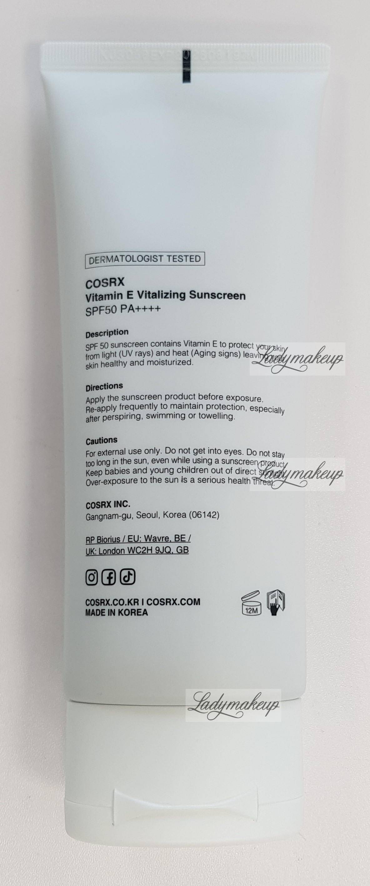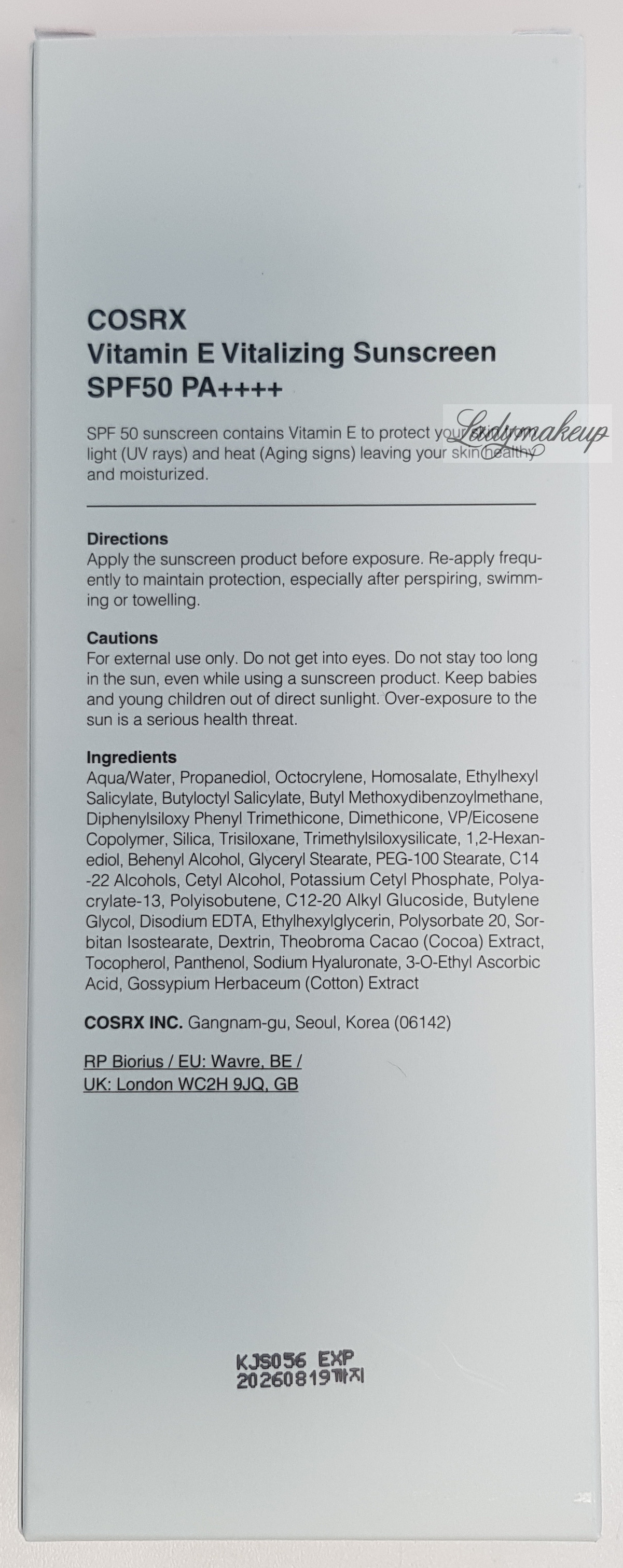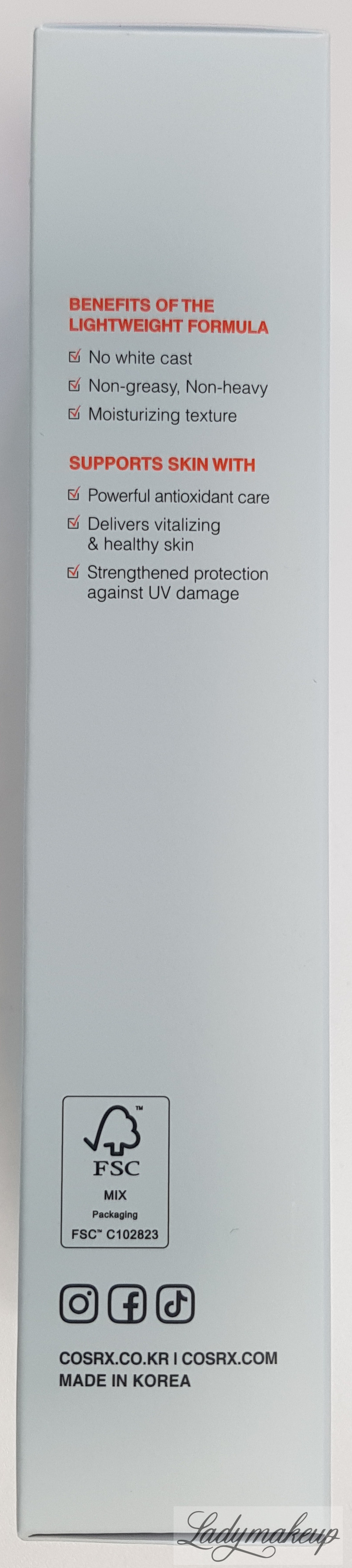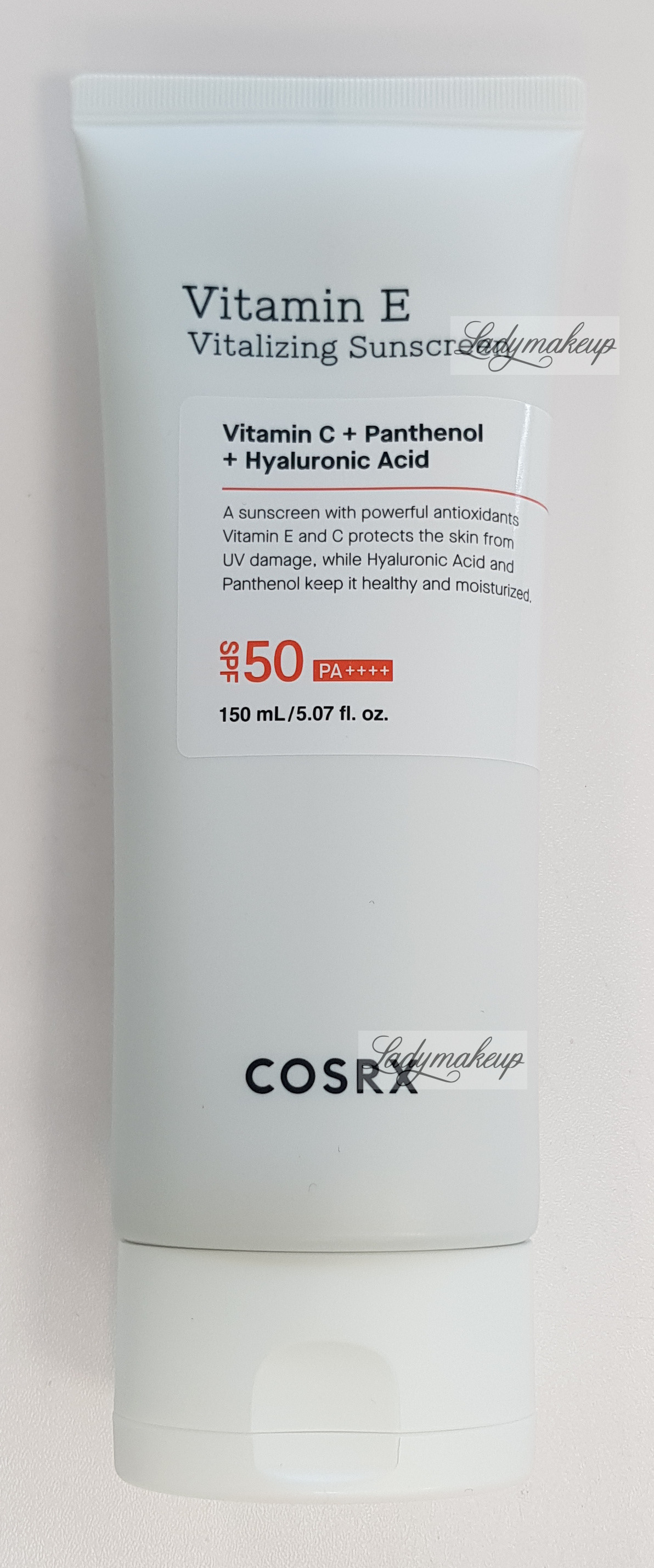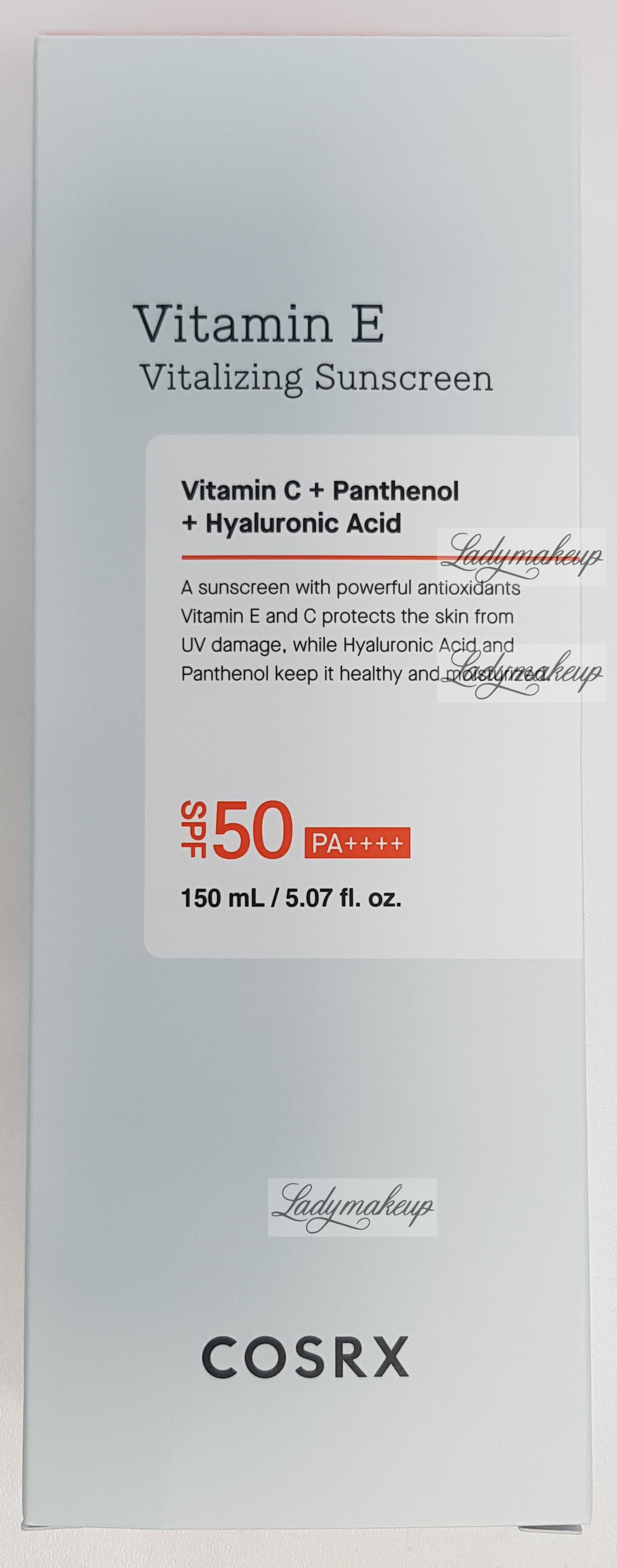 Krem do twarzy. Stworzony jest specjalnie z myślą o pielęgnacji skóry każdego rodzaju. W swoim składzie zawiera takie składniki aktywne jak: witamina E, kwas 3-0-etylo-askorbinowy, pantenol oraz hialuronian sodu. Krem Cosrx posiada silne działanie nawilżające, antyoksydacyjne oraz wspomaga procesy regeneracyjne. Jednocześnie łagodzi oraz koi wszelkie podrażnienia i stany zapalne, niweluje działanie wolnych rodników, a także zmiękcza, wygładza i rozjaśnia naskórek. Dodatek filtra SPF50+ PA++++ zapewnia niezwykle wysoki stopień ochrony przed szkodliwym działaniem promieni UVA oraz UVB. Kosmetyk SPF50 dostępny jest w opakowaniu o pojemności 50 ml.