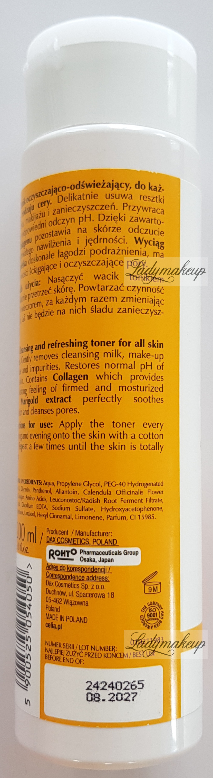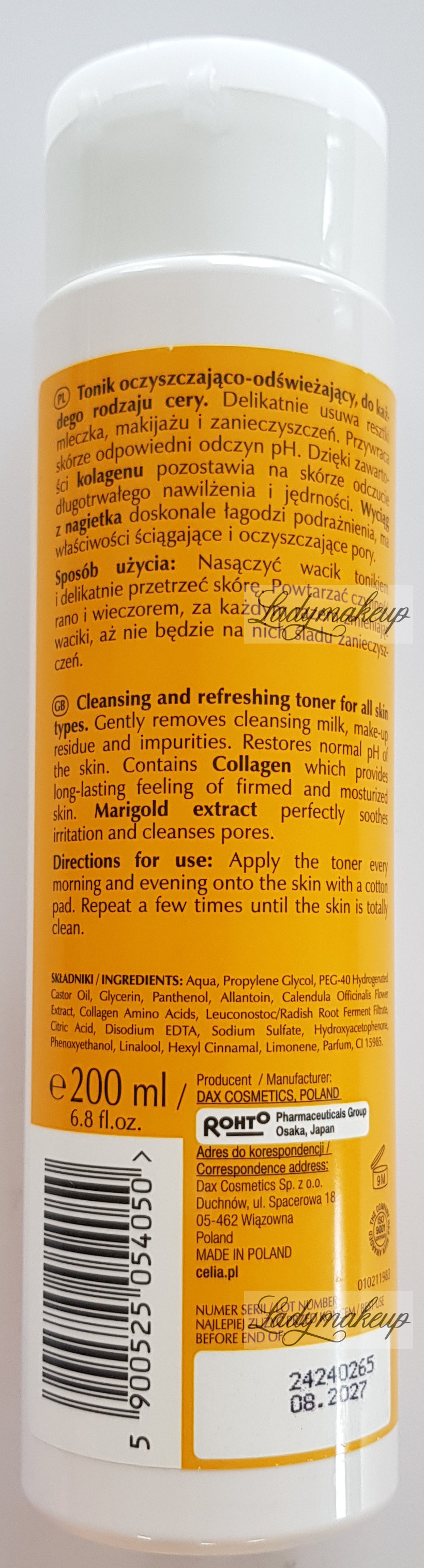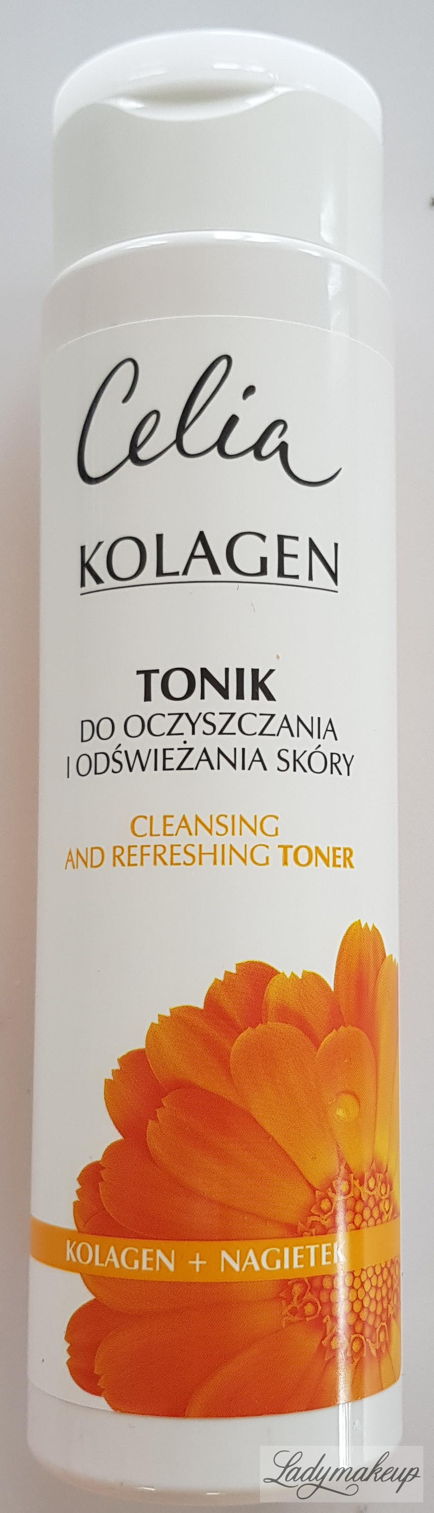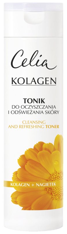 Tonik do twarzy. Przeznaczony do pielęgnacji cery każdego rodzaju. Delikatnie usuwa resztki mleczka, makijażu oraz zanieczyszczeń z powierzchni twarzy. Natychmiastowo odświeża, tonizuje oraz przywraca skórze odpowiednie PH. Dodatkowo tonik Celia został wzbogacony o specjalnie wyselekcjonowane składniki aktywne takie jak: kolagen oraz wyciąg z nagietka, które aktywnie pielęgnują oraz dbają o dobrostan cery. Dodatkowo Celia tonik dobrze nawilża, łagodzi i koi podrażnienia, a także ujędrnia naskórek. Kosmetyk dostępny jest w butelce o pojemności 200 ml.