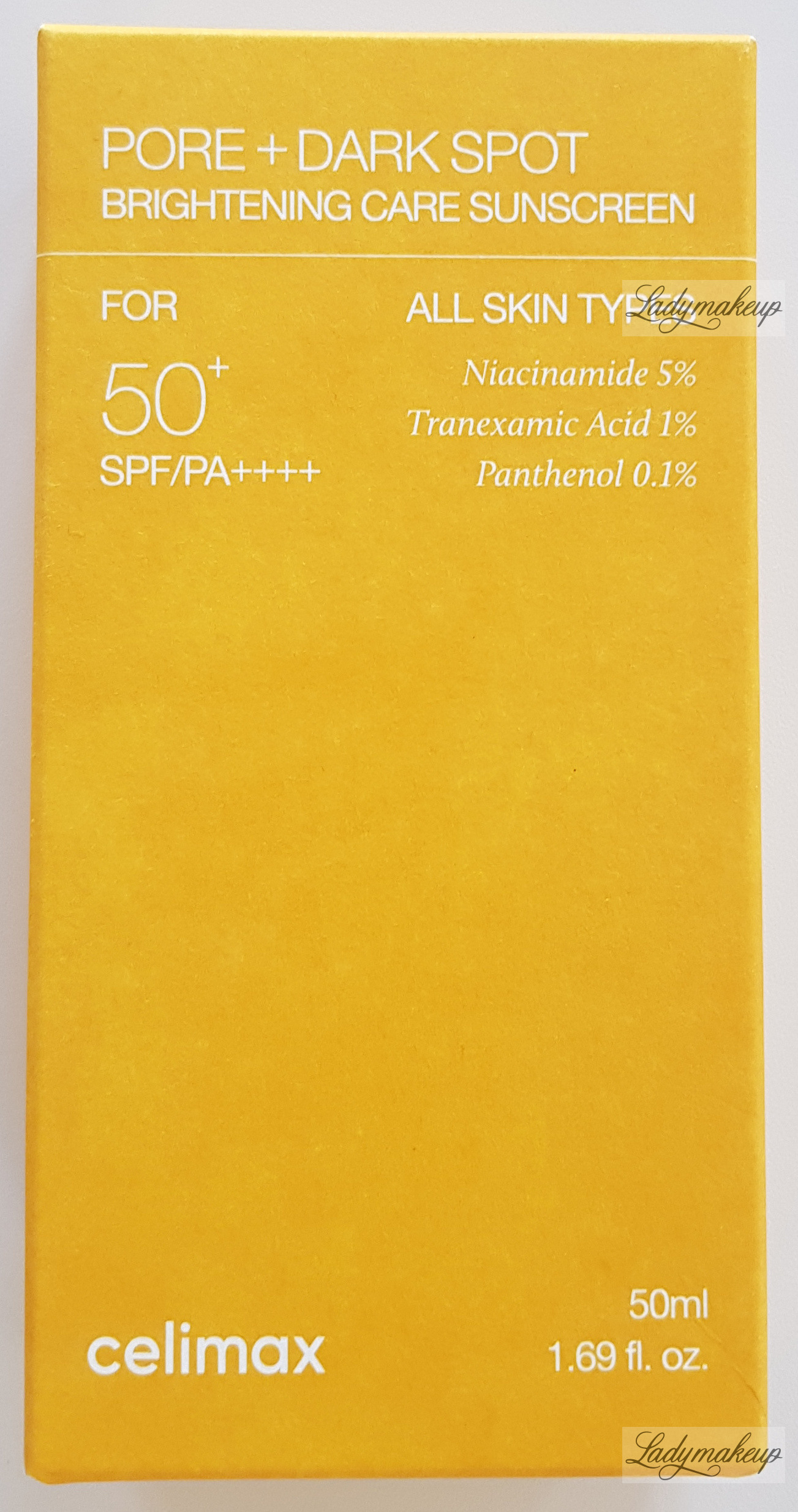 Krem do twarzy . Przeznaczony do codziennej pielęgnacji skóry każdego rodzaju, w szczególności z przebarwieniami i przetłuszczającej się. W swojej formule zawiera takie składniki aktywne jak: niacynamid, kwas traneksamowy, pantenol oraz adenozynę. Krem Celimax dobrze nawilża, łagodzi i koi podrażnienia, rozjaśnia przebarwienia, wyrównuje koloryt skóry, a także opóźnia procesy starzenia. Jednocześnie przyspiesza gojenie się naskórka oraz reguluje pracę gruczołów łojowych. Dodatek filtra SPF 50+ PA++++ skutecznie chroni skórę przed szkodliwym działaniem promieni słonecznych UVA i UVB, takim jak tworzenie przebarwień czy fotostarzenie. Kosmetyk dostępny jest w poręcznej tubce o pojemności 50 ml.