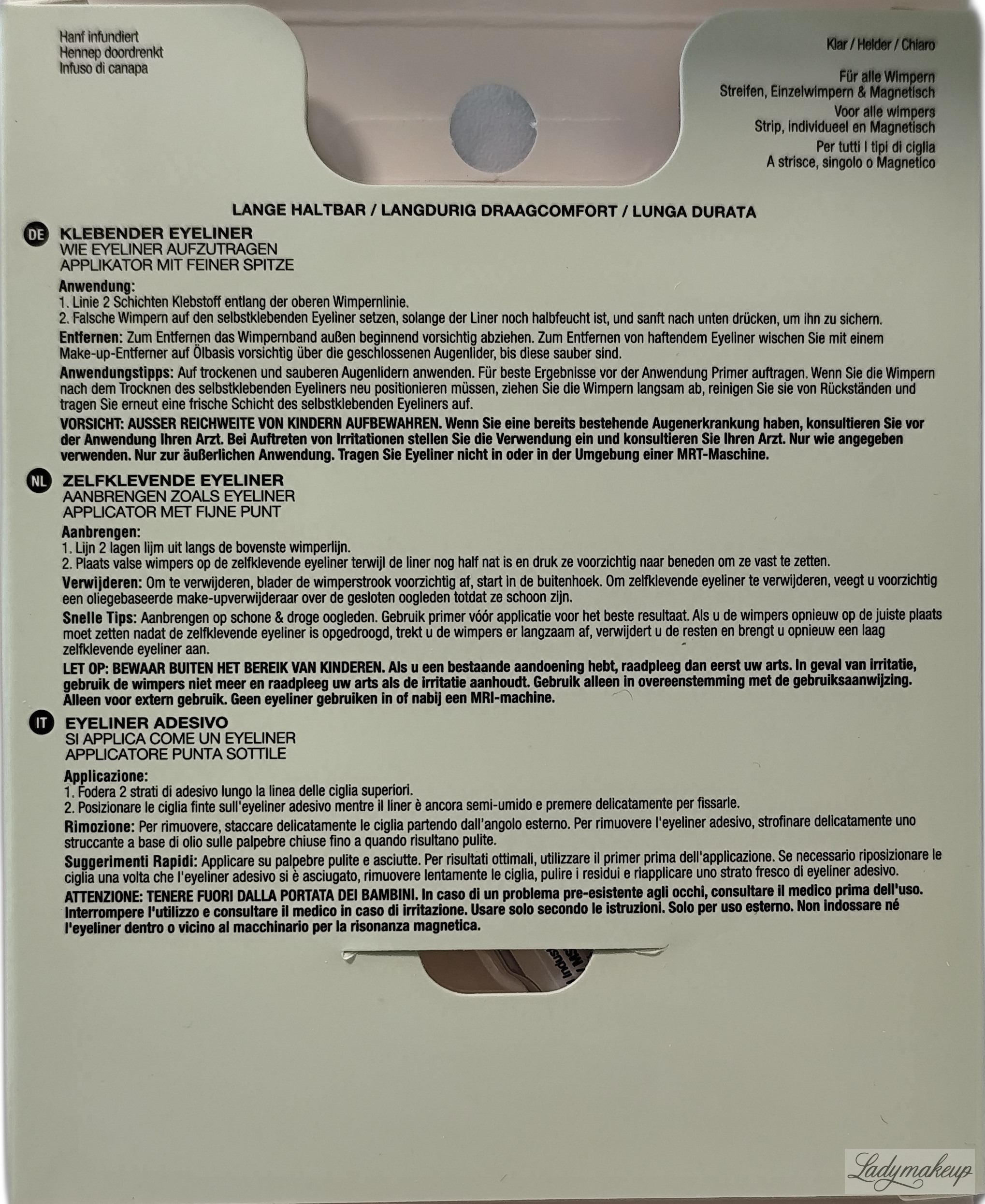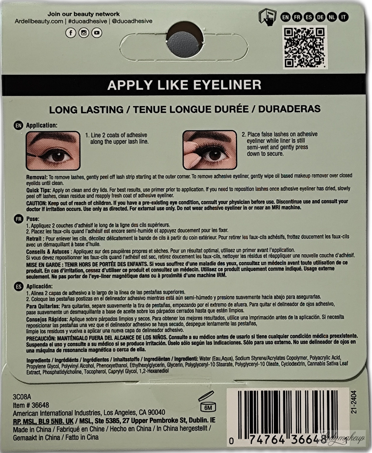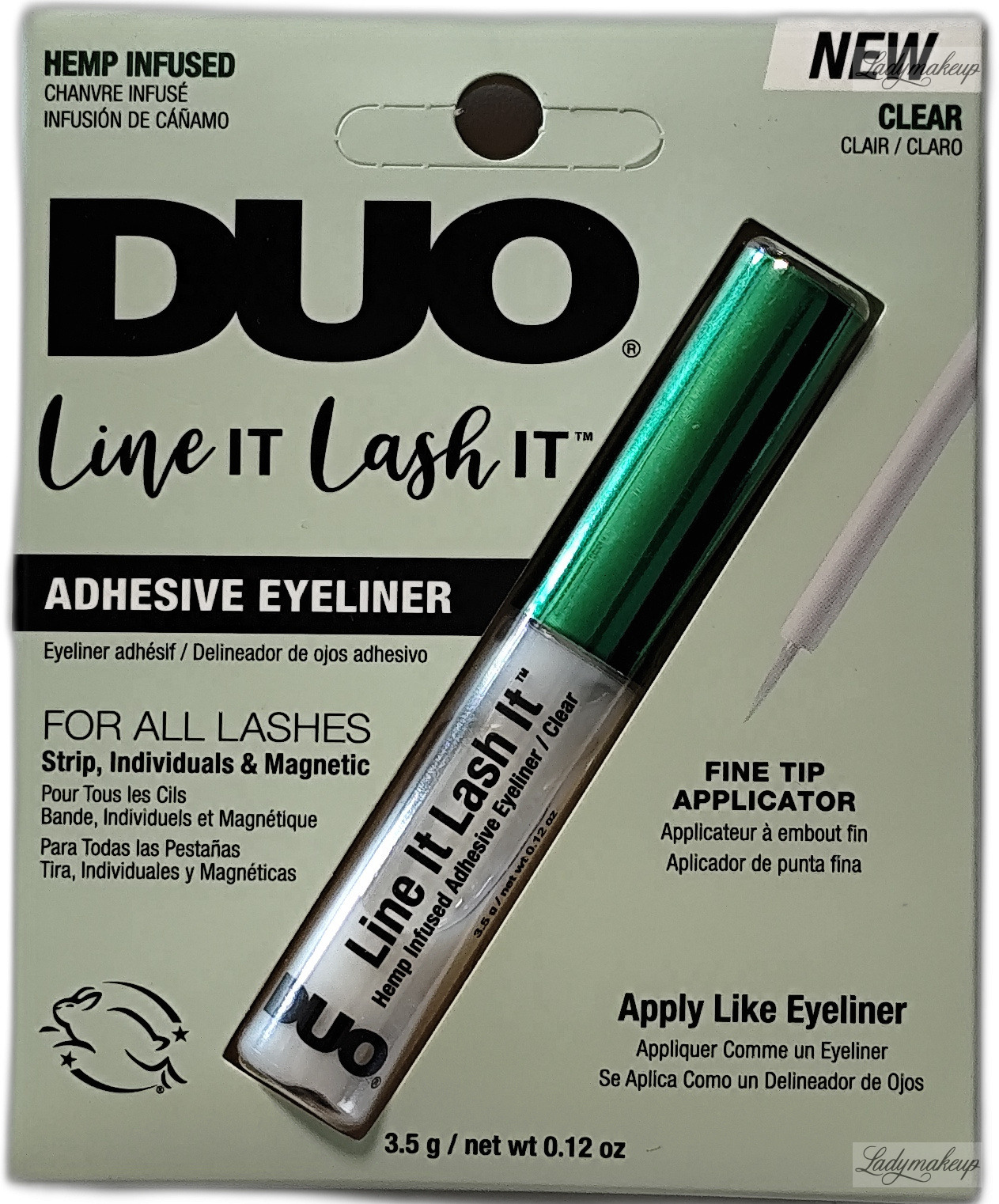 Klej i eyeliner w jednym. To doskonałe rozwiązanie problemu z widocznym klejem na powiece po procesie aplikacji rzęs. Produkt posiada biało-perłową formułę, która po wyschnięciu staje się przezroczysta. Innowacyjna formuła produktu sprawia, że posiada dwa różne zastosowania, jako eyeliner oraz jako klej do rzęs. Produkt kiedy jest mokry, ma bardzo dobre właściwości klejące, zaś po zastygnięciu i zaschnięciu działa jak liner do powiek. Klej Duo wzbogacony został o olej z konopi, który aktywnie pielęgnuje. Specjalny pędzelkowy aplikator zapewnia niezwykle szybką, sprawną oraz precyzyjną aplikację. Dostępny jest w opakowaniu o pojemności 3,5 g.