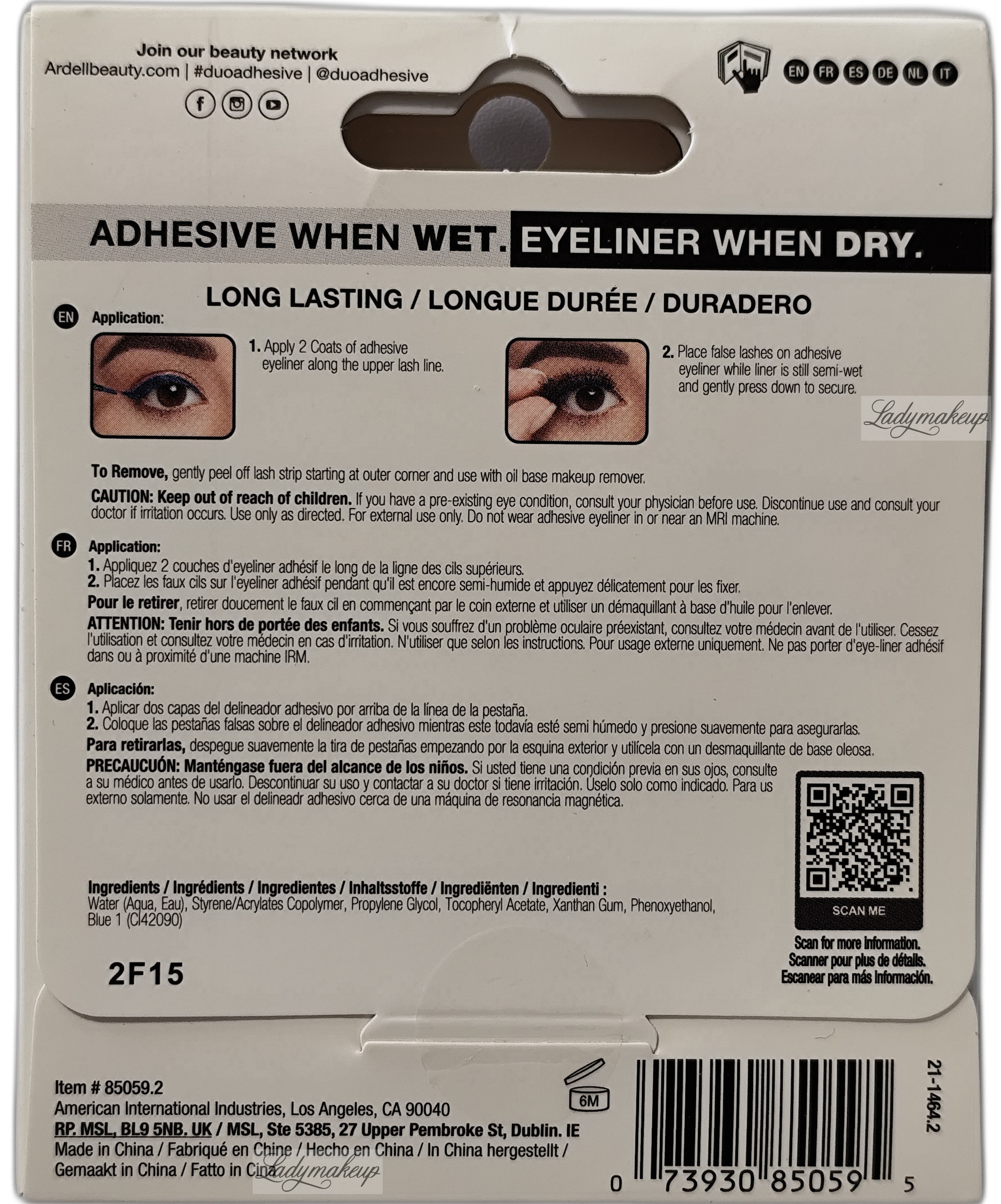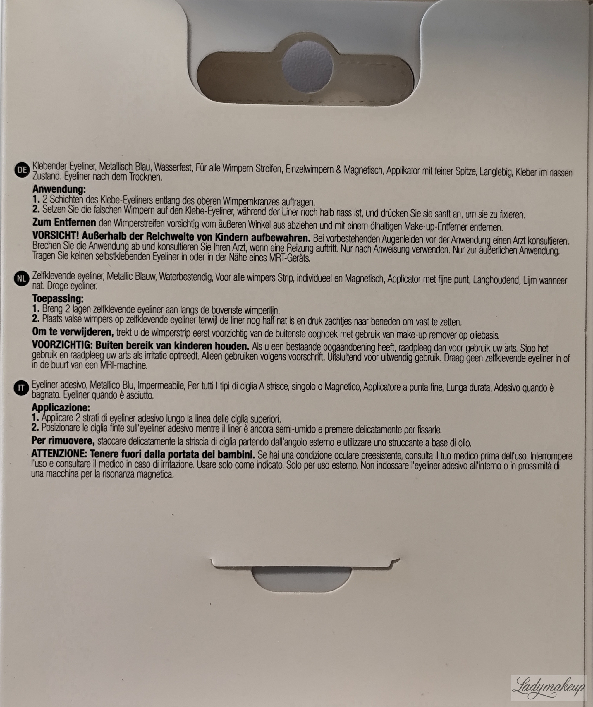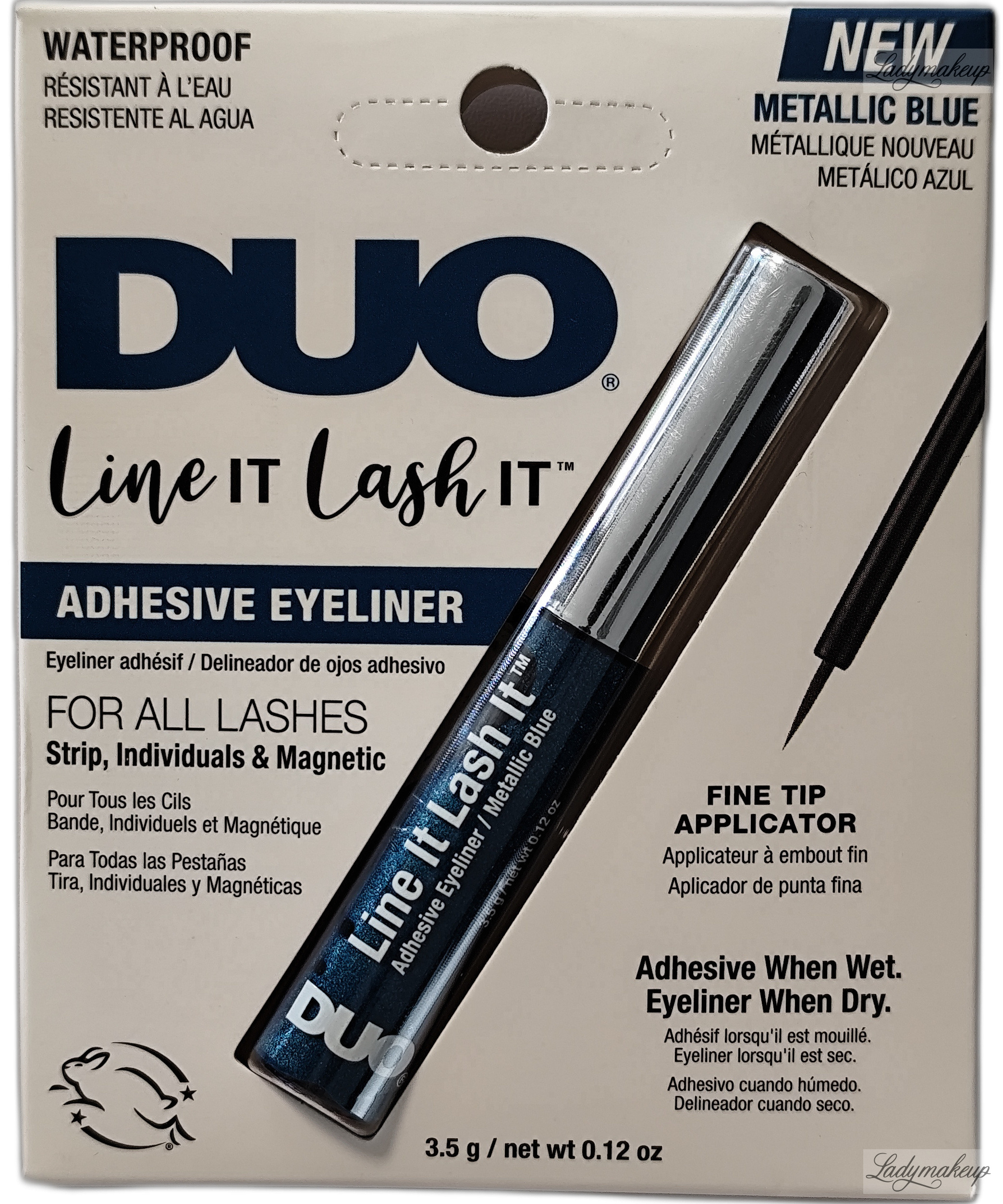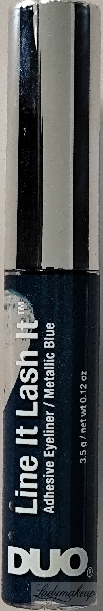 Klej i eyeliner w jednym. To doskonałe rozwiązanie problemu z widocznym klejem na powiece po procesie aplikacji rzęs. Produkt posiada innowacyjny oraz bardzo oryginalny odcień metalicznego niebieskiego. Specjalna formuła produktu sprawia, że posiada dwa różne zastosowania, jako eyeliner oraz jako klej do rzęs. Produkt kiedy jest mokry, ma bardzo dobre właściwości klejące, zaś po zastygnięciu i zaschnięciu działa jak liner do powiek. Klej Duo wyposażony został w specjalny pędzelkowy aplikator, który zapewnia niezwykle szybką, sprawną oraz precyzyjną aplikację. Dostępny jest w opakowaniu o pojemności 3,5 g.