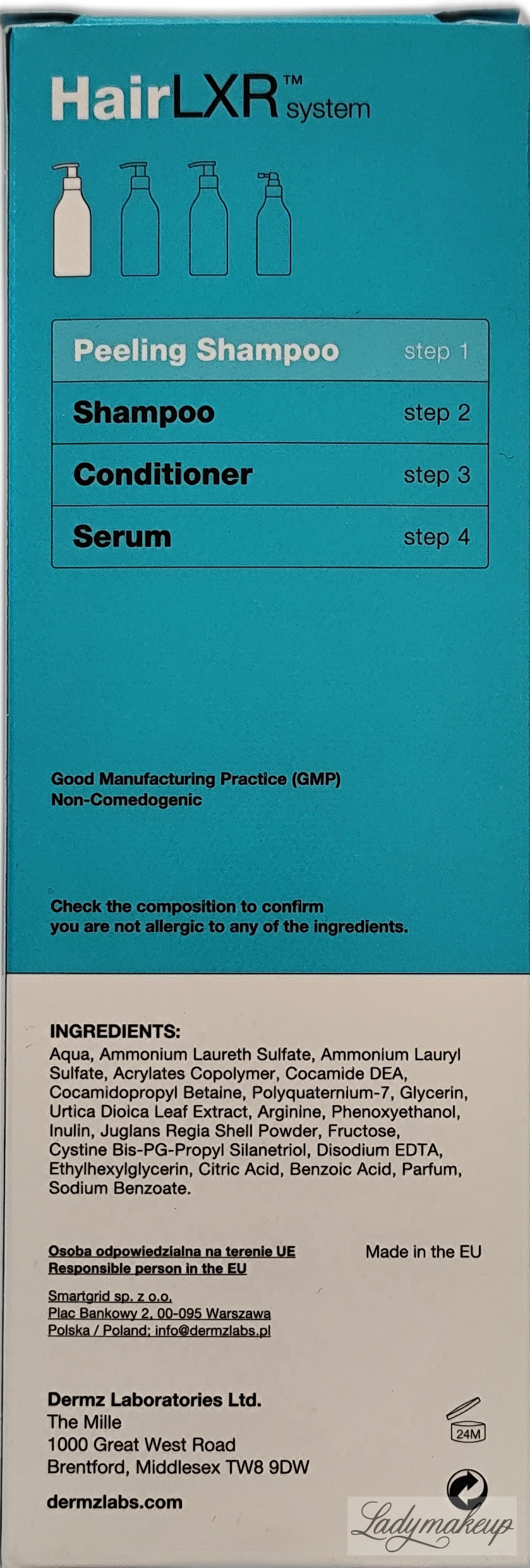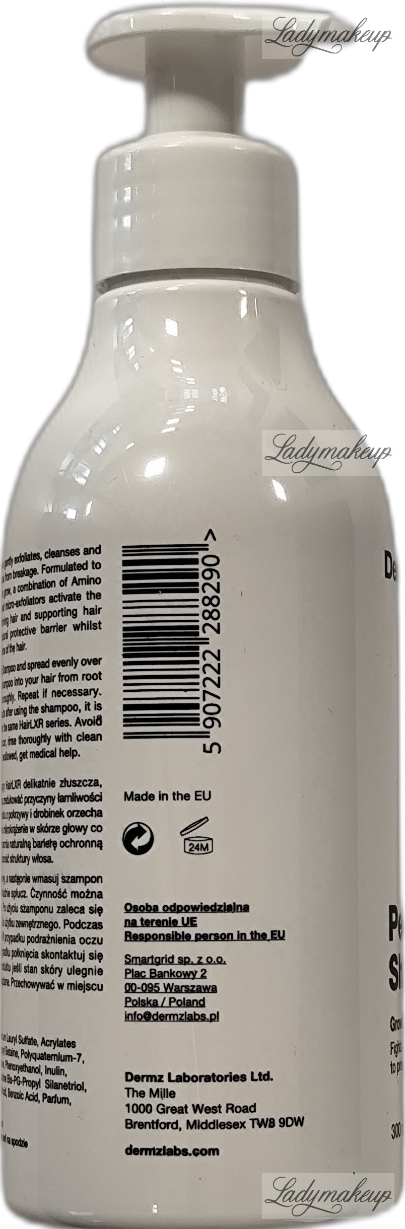 Szampon do włosów. Przeznaczony do pielęgnacji pasm każdego rodzaju. W swojej formule posiada takie składniki aktywne jak: aminokwasy, ekstrakt z pokrzywy oraz drobinki orzecha włoskiego. Dermz szampon delikatnie złuszcza oraz dobrze oczyszcza skórę z wszelkich zanieczyszczeń oraz nadmiaru sebum. Skutecznie stymuluje mieszki oraz korzeń włosa do wzrostu zdrowszych oraz gęstszych pasm. Dodatkowo koi podrażnienia, dogłębnie nawilża, a także regeneruje łuskę włosa. Regularnie stosowany przywraca równowagę skórze głowy. Kosmetyk dostępny jest w opakowaniu o pojemności 300 ml, z wygodną pompką dozującą odpowiednią ilość produktu.