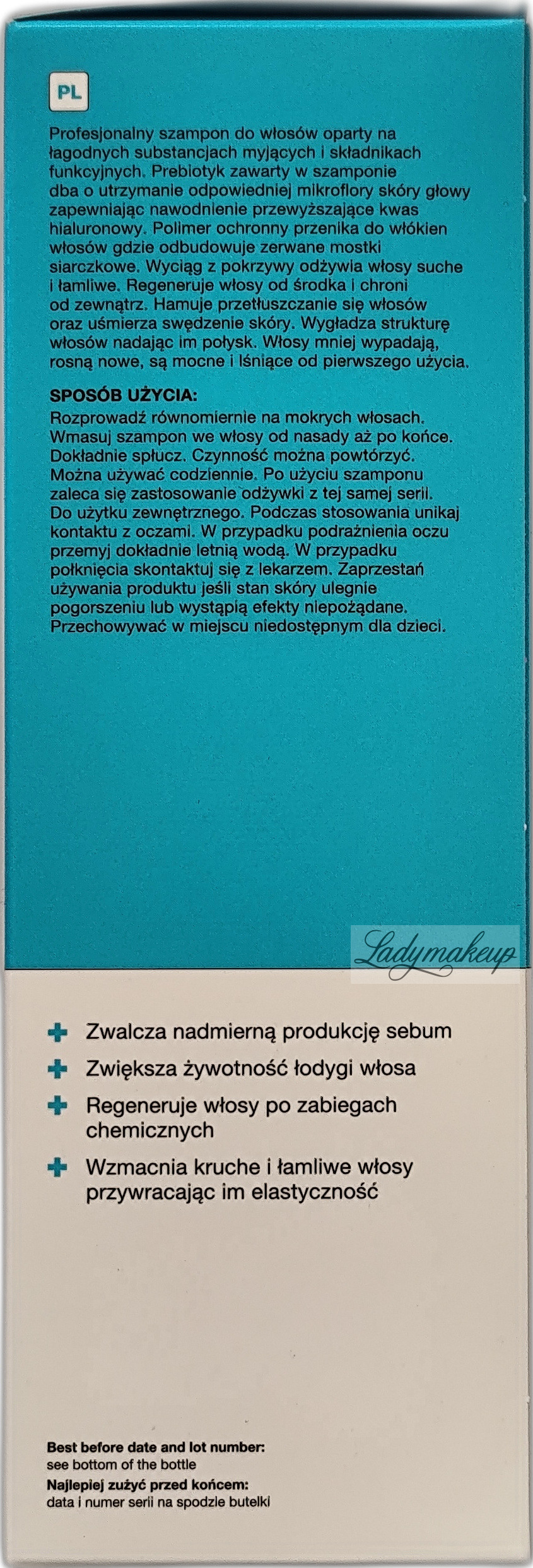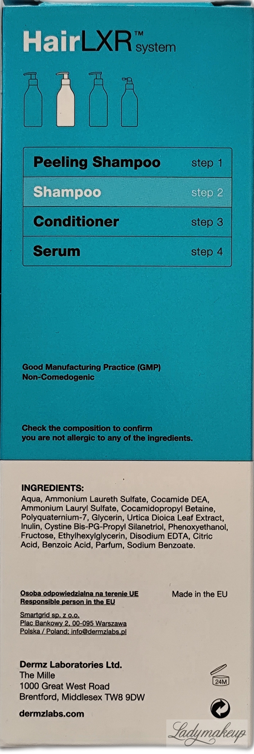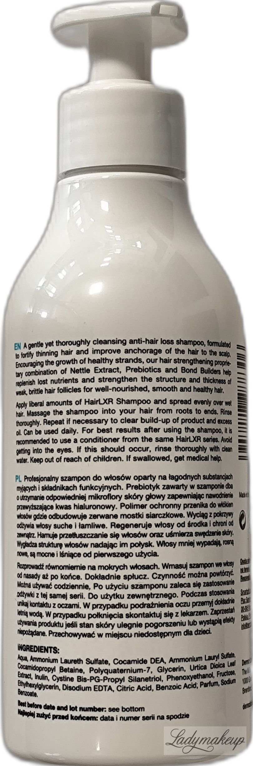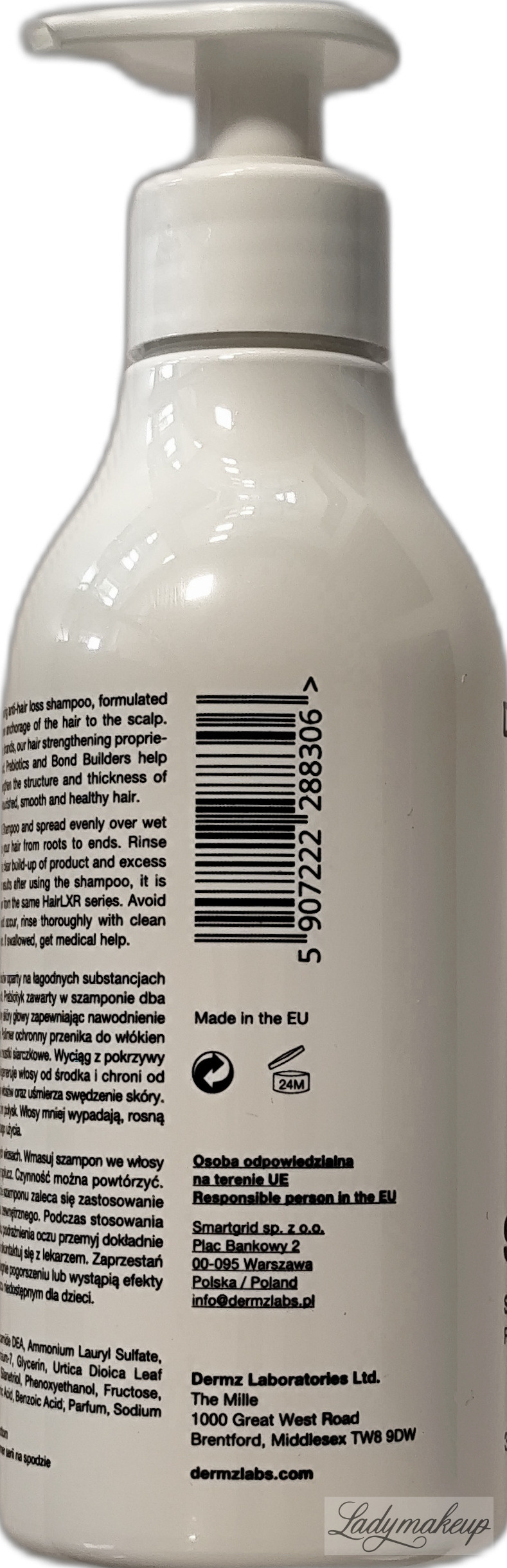 Szampon do włosów. Przeznaczony do codziennej pielęgnacji pasm osłabionych, wypadających, łamliwych oraz przerzedzonych. W swoim składzie zawiera takie pielęgnacyjne składniki aktywne jak: ekstrakt z liści pokrzywy, ekstrakt z orzecha włoskiego, arginina oraz inulina. Łagodnie myje oraz dobrze oczyszcza skórę z wszelkich zanieczyszczeń. Szampon Dermz wzmacnia pasma, tym samym zapobiegając ich nadmiernemu wypadaniu. Dodatkowo widocznie je zagęszcza, zmniejsza przetłuszczanie i swędzenie skóry głowy, a także przywraca im miękkość i zdrowy blask. Kosmetyk dostępny jest w opakowaniu o pojemności 300 ml.