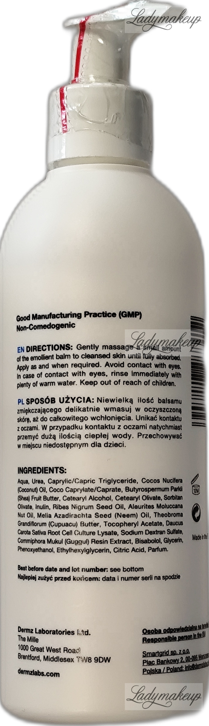Balsam do ciała. Będzie niezastąpiony w pielęgnacji skóry wrażliwej, reaktywnej oraz podrażnionej, a także dla osób zmagających się z egzemą czy łuszczycom. W 48% zawiera emolienty, a także inulinę, dextran, olej kukui, olej z czarnej porzeczki, masło cupuacu, komórki macierzyste z marchwi oraz kompleks guggul. Balsam Dermz posiada silne działanie łagodzące i kojące podrażnienia, a także zwiększa poziom nawilżenia, ujędrnienia i uelastycznienia. Wzmacnia uszkodzoną barierę lipidową naskórka, łagodzi suchość i łuszczenie, a także chroni przed wolnymi rodnikami i stanami zapalnymi. Dodatkowo Dermz balsam skutecznie regeneruje i odbudowuje barierę ochronną naskórka, a także łagodzi objawy łuszczycy oraz egzemy. Kosmetyk dostępny jest w opakowaniu o pojemności 250 ml.