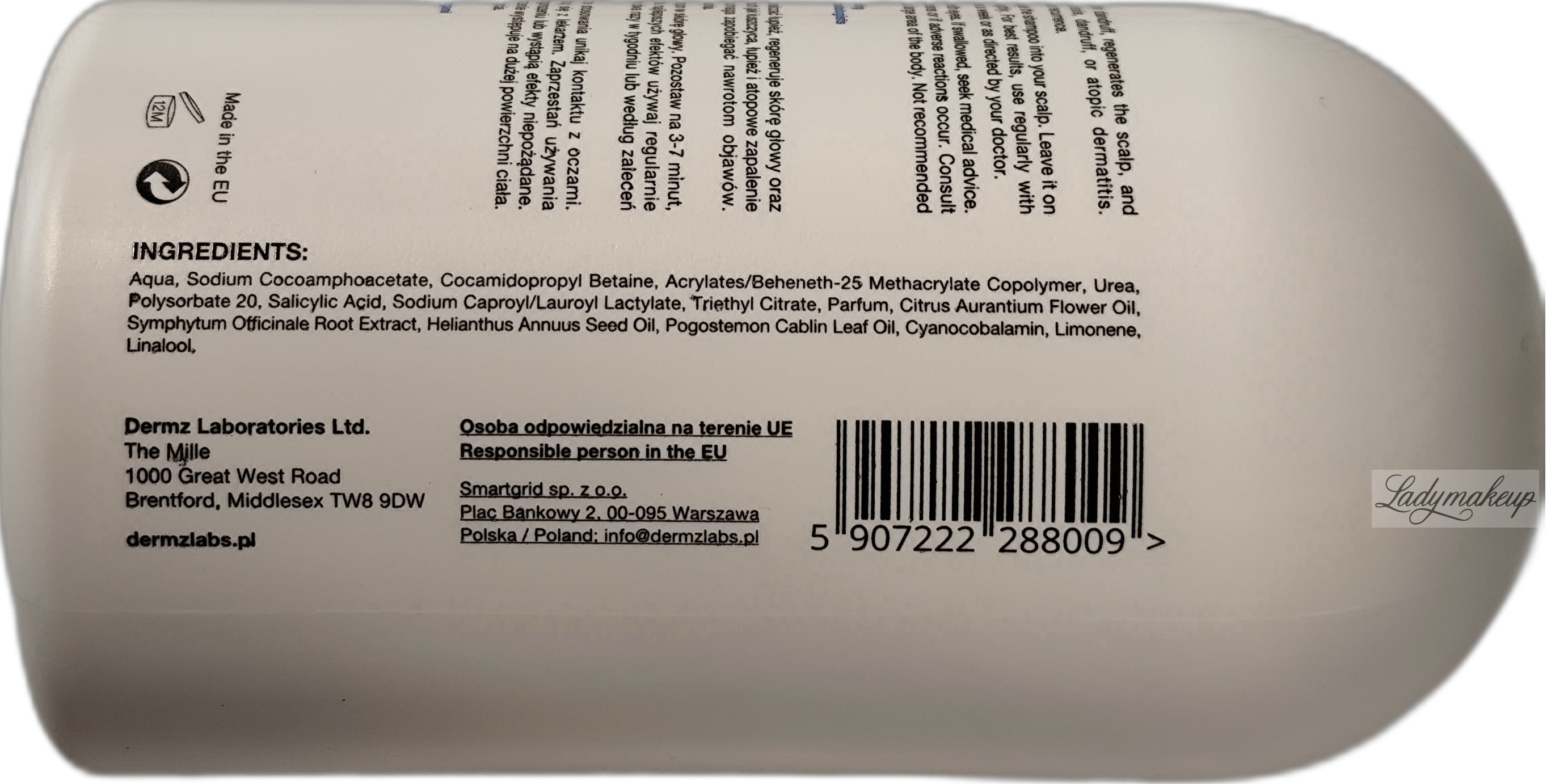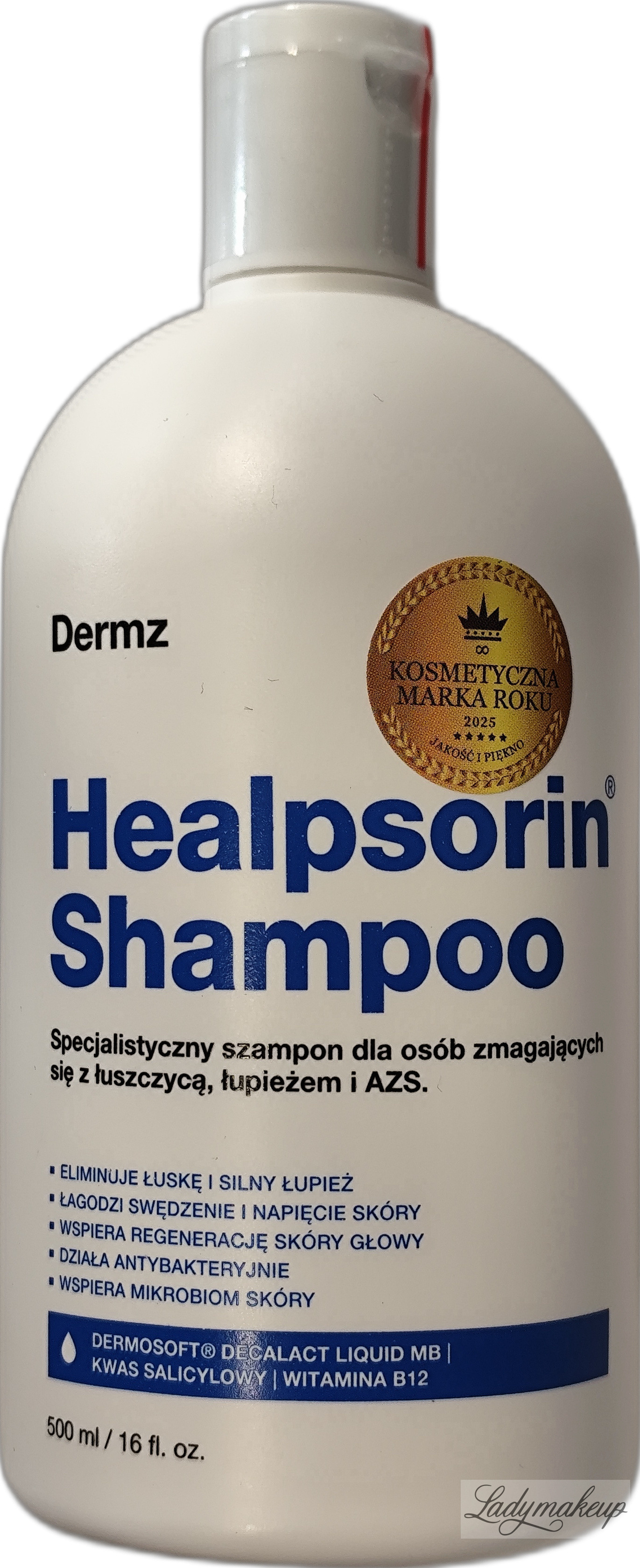 Szampon do włosów. Powstał na bazie specjalistycznej receptury i jest skierowany do osób zmagających się z łuszczycą, łupieżem oraz AZS. Swoje działanie opiera na bazie 5 kluczowych składników aktywnych, takich jak: macerat z żywokostu lekarskiego, kwas salicylowy, Olejek z kwiatów gorzkiej pomarańczy, mocznik oraz kompleks Dermosoft Decalact Liquid MB. Szampon Dermz zawiera w sobie delikatne substancje myjące, które łagodnie oczyszczają skórę głowy. Skutecznie redukuje łuskę oraz łupież znacząco poprawiając wygląd i komfort skóry głowy. Jednocześnie łagodzi swędzenie, pieczenie i uczucie napięcia, a także dogłębnie nawilża oraz regeneruje pasma. Ponadto Dermz szampon posiada działanie przeciwbakteryjne, tym samym eliminując drobnoustroje, które są przyczyną problemów skalpu. Widocznie wzmacnia włosy, przywraca im witalność oraz zdrowy blask oraz ułatwia ich rozczesywanie. Kosmetyk dostępny jest w butelce o pojemności 500 ml.